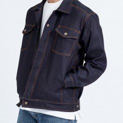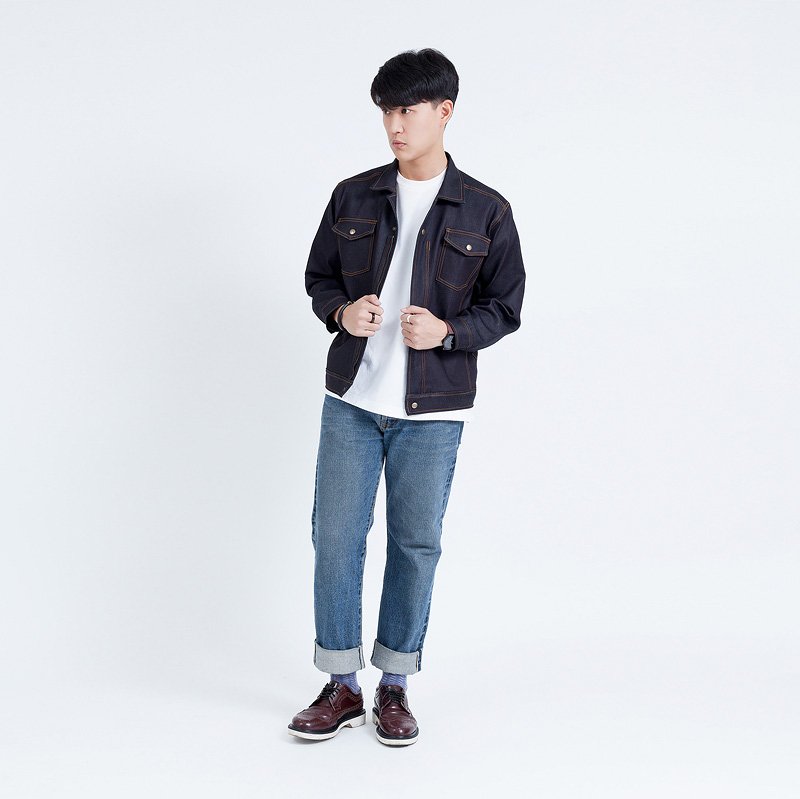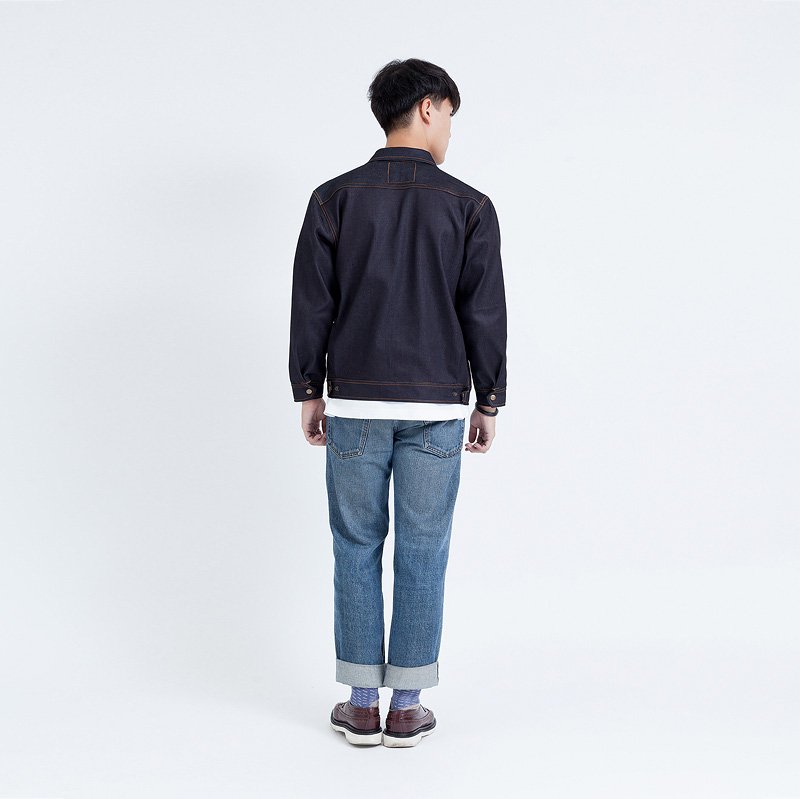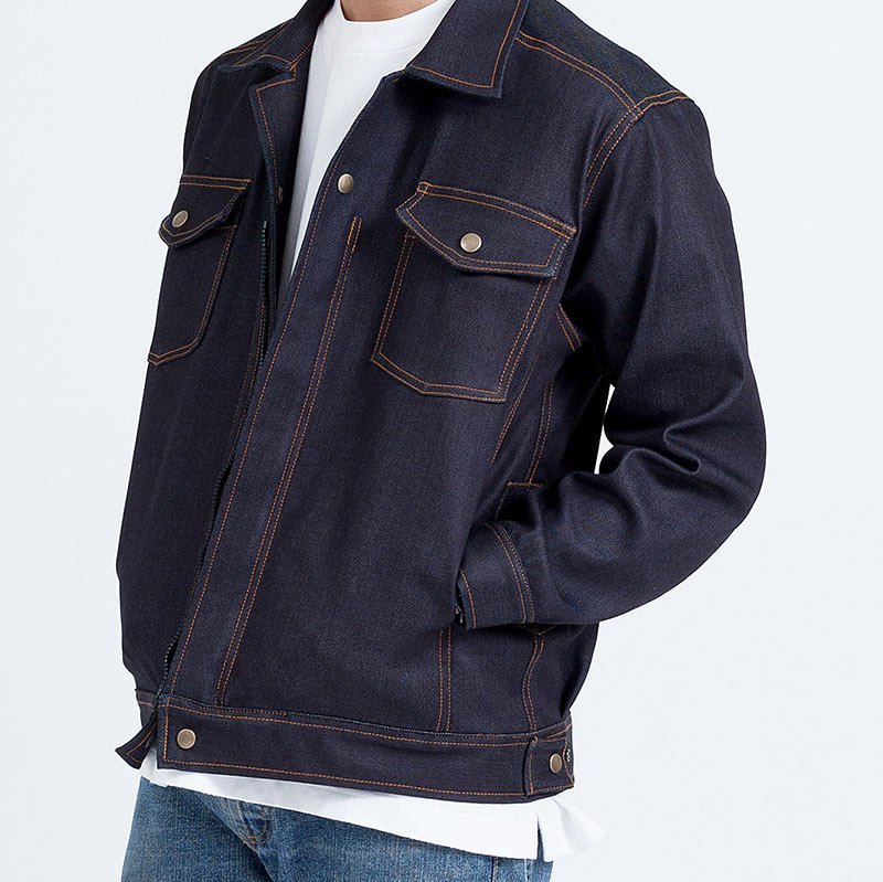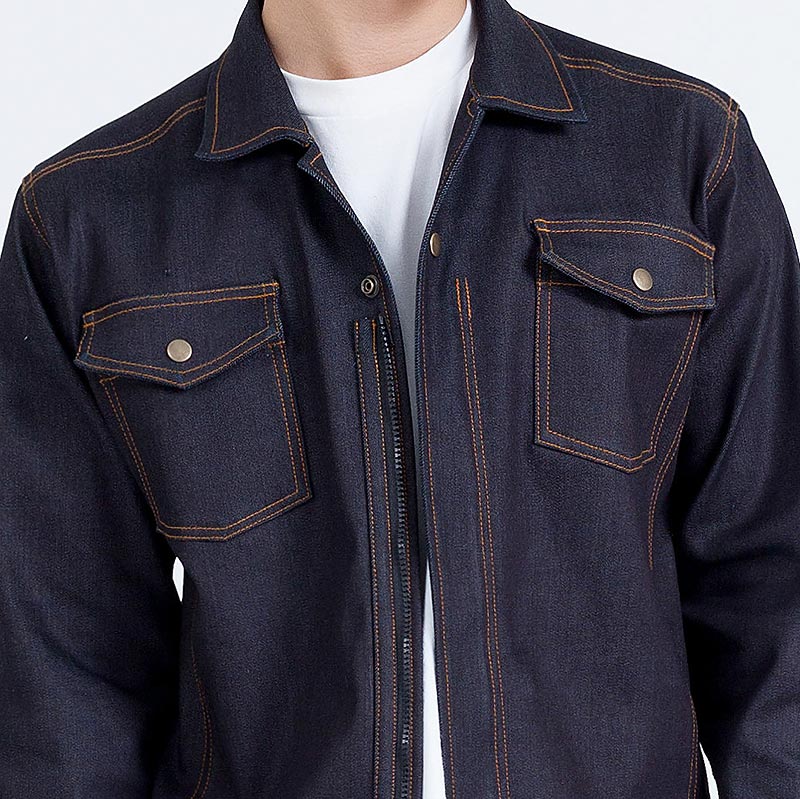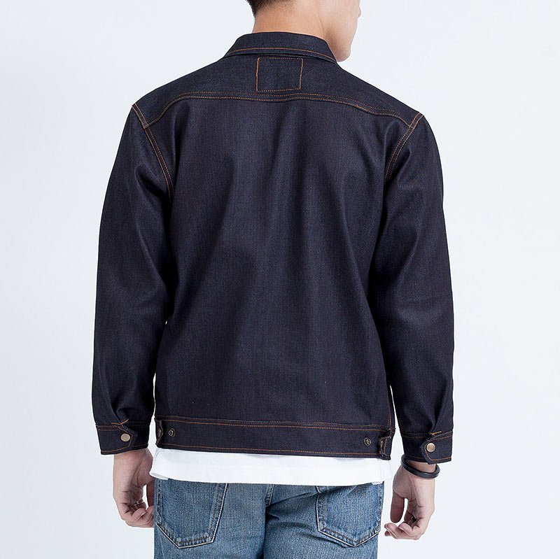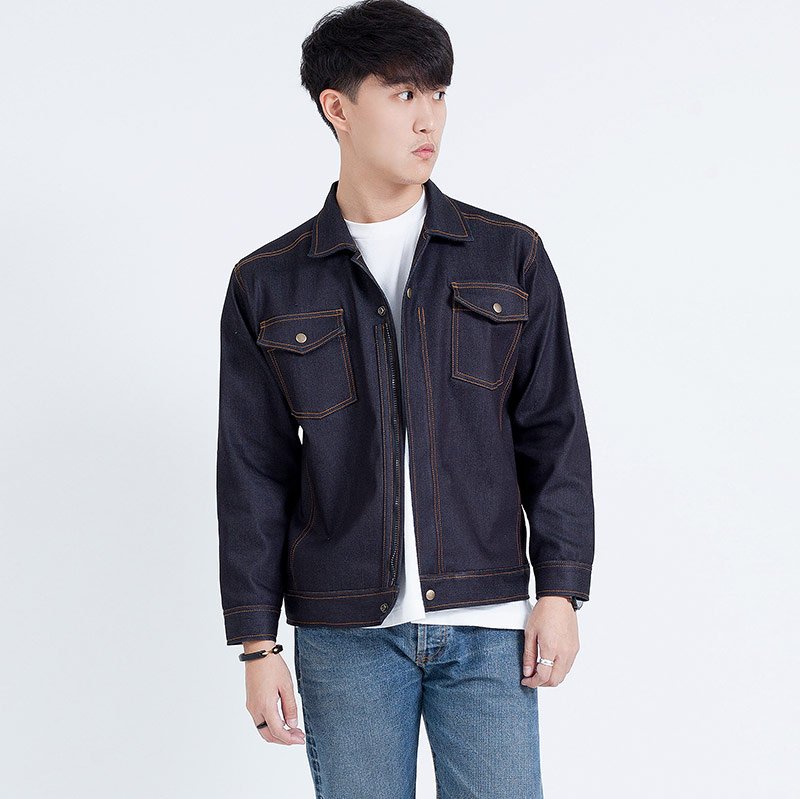 เสื้อแจ็คเก็ตยีนส์ผู้ชายแขนยาว ทรงวินเทจชายสั้น สียีนส์เข้ม ผ้ายีนส์หนา 10-12oz ขูดขนด้านในนุ่ม ใส่สบาย ตัวเสื้อผ่าหน้ามีซิปติดกระดุมบนล่าง ลงด้ายยีนส์ทองเส้นคู่ กระเป๋าหน้าสองข้าง ซ่อนกระเป๋าข้างสำหรับกันหนาวสองข้าง และช่องใส่อุปกรณเครื่องเขียนด้านข้างลำตัวฝั่งซ้าย