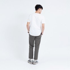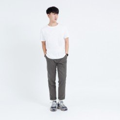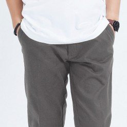 กางเกงขายาวผู้ชาย ผ้าชิโน Cotton Peach ฟอกนิ่ม สีเทาเบจเข้ม เนื้อผ้านุ่มพิเศษ ใส่สบาย ออกแบบด้วยกระเป๋าเจาะด้านหลัง ทรง Vintage Loose ปลายขาเข้ารูป