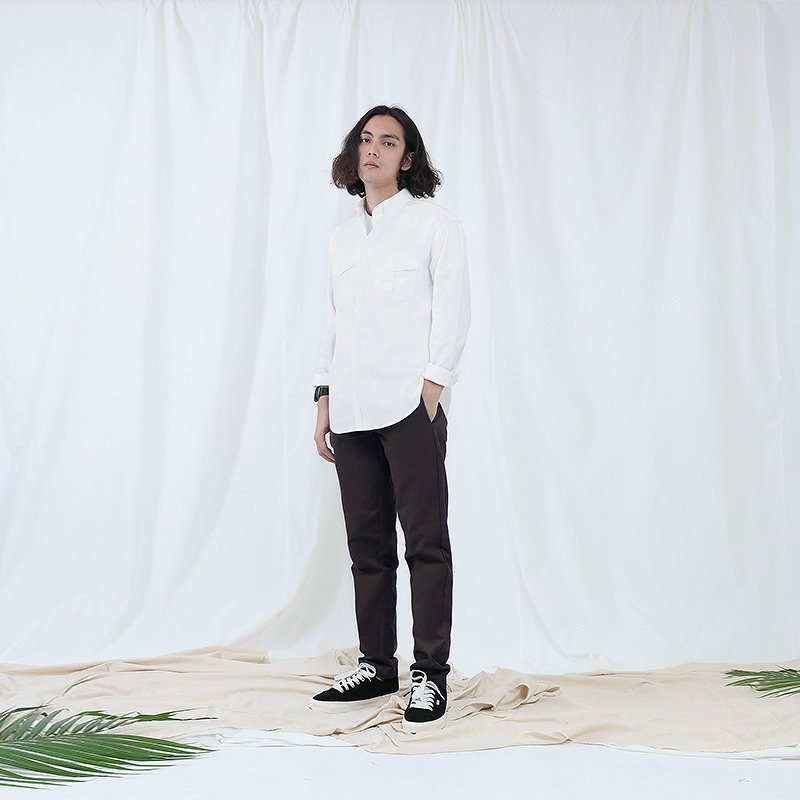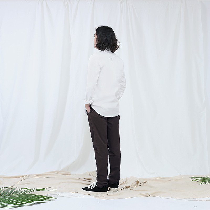 กางเกงขายาวผู้ชาย ผ้าชิโน Cotton Peach ฟอกนิ่ม สีน้ำตาลเข้ม Dark Brown เนื้อผ้านุ่มพิเศษ ใส่สบาย ออกแบบด้วยกระเป๋าเจาะด้านหลัง ทรง Vintage Loose ปลายขาเข้ารูป