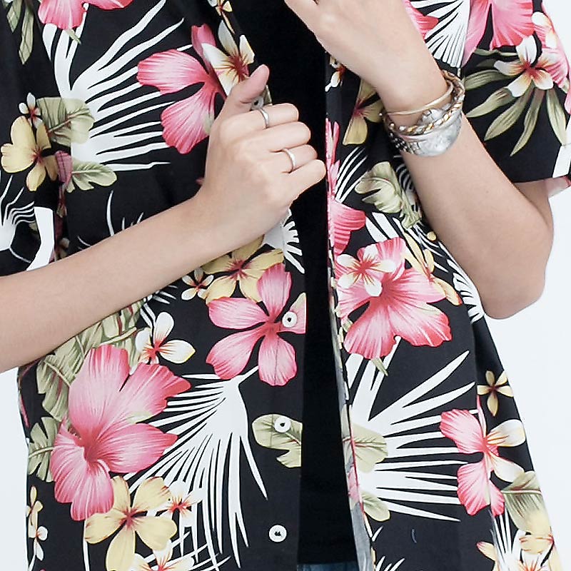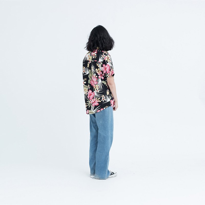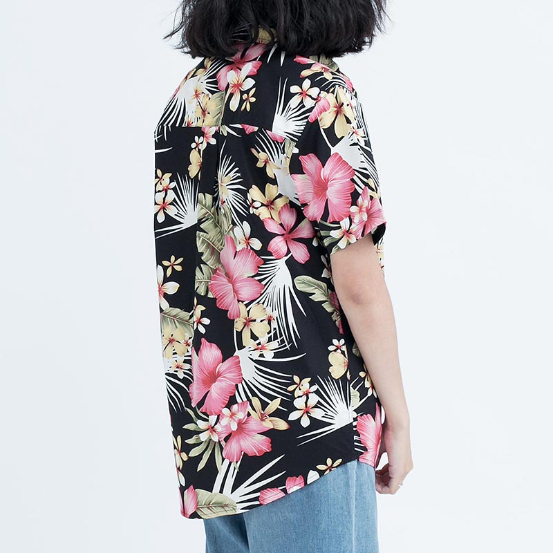 เสื้อเชิ้ตผู้หญิงแขนสั้น พิมพ์ลายดอกญี่ปุ่นสีชมพู พื้นสีดำ งานพิมพ์แน่นทั้งตัว ผ้า Cotton 100%