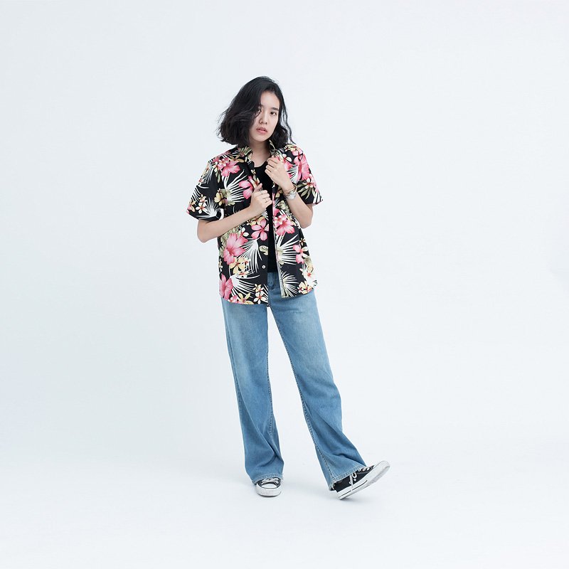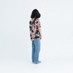 Mr.177 เสื้อเชิ้ตผู้หญิงแขนสั้น ลายดอกญี่ปุ่นสีดำ