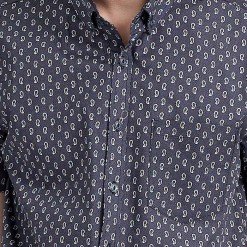 เสื้อเชิ้ตผู้ชายแขนสั้น พิมพ์ลายจุด Paisley สีดำ งานพิมพ์แน่นทั้งตัว ติดกระดุมที่ปกเสื้อ ผ้า Cotton 100%