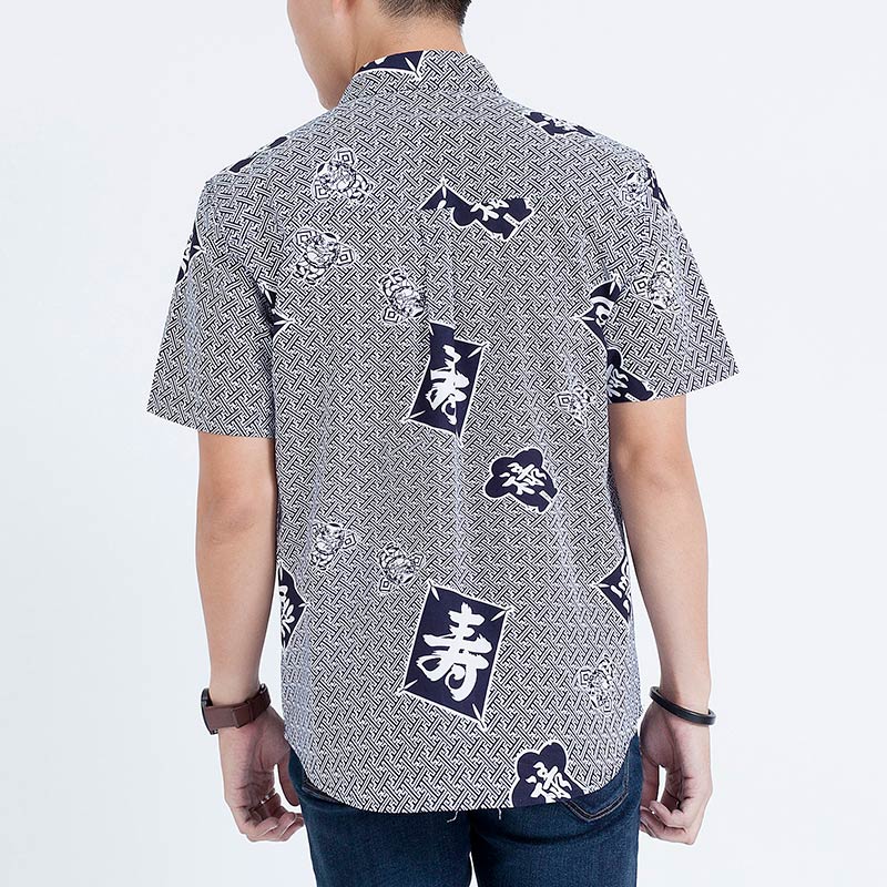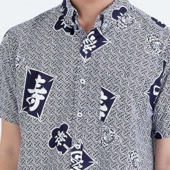 เสื้อเชิ้ตผู้ชายแขนสั้น พิมพ์ลาย Japanese Typo สีน้ำเงินเข้ม พื้นสีขาว งานพิมพ์แน่นทั้งตัว ติดกระดุมที่ปกเสื้อ ผ้า Cotton 100%