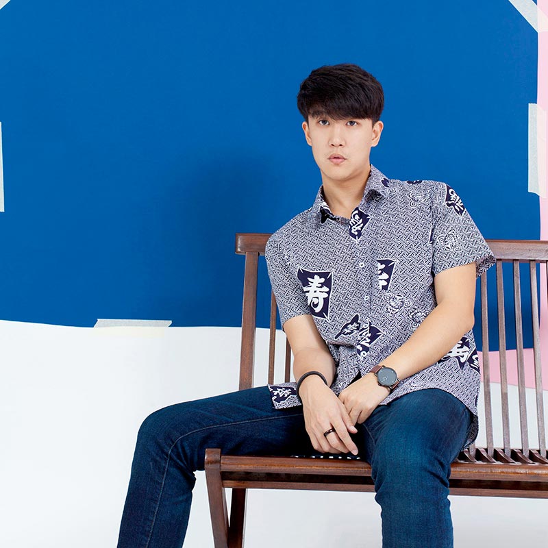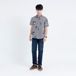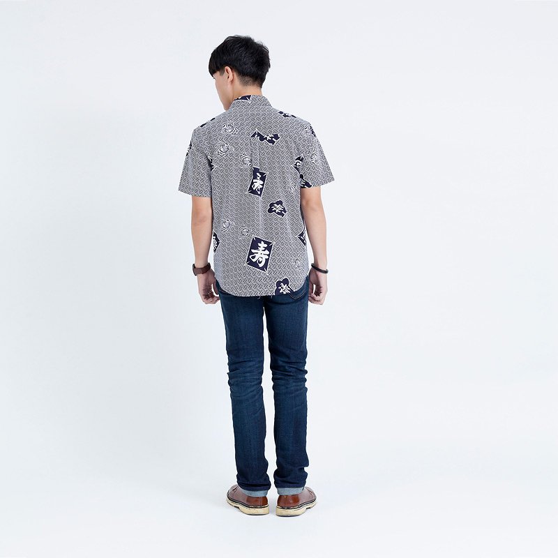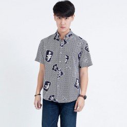 Mr.504 เสื้อเชิ้ตผู้ชายแขนสั้น ลาย Japanese Typo สีน้ำเงินเข้มพื้นขาว