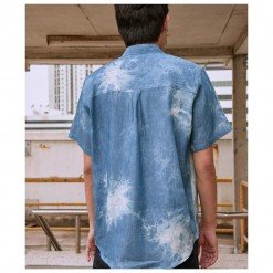 เสื้อเชิ้ตผู้ชายแขนสั้น ติดกระดุมที่ปกเสื้อ ผ้า Cotton ผสม มัดย้อมคราม สีฟ้า