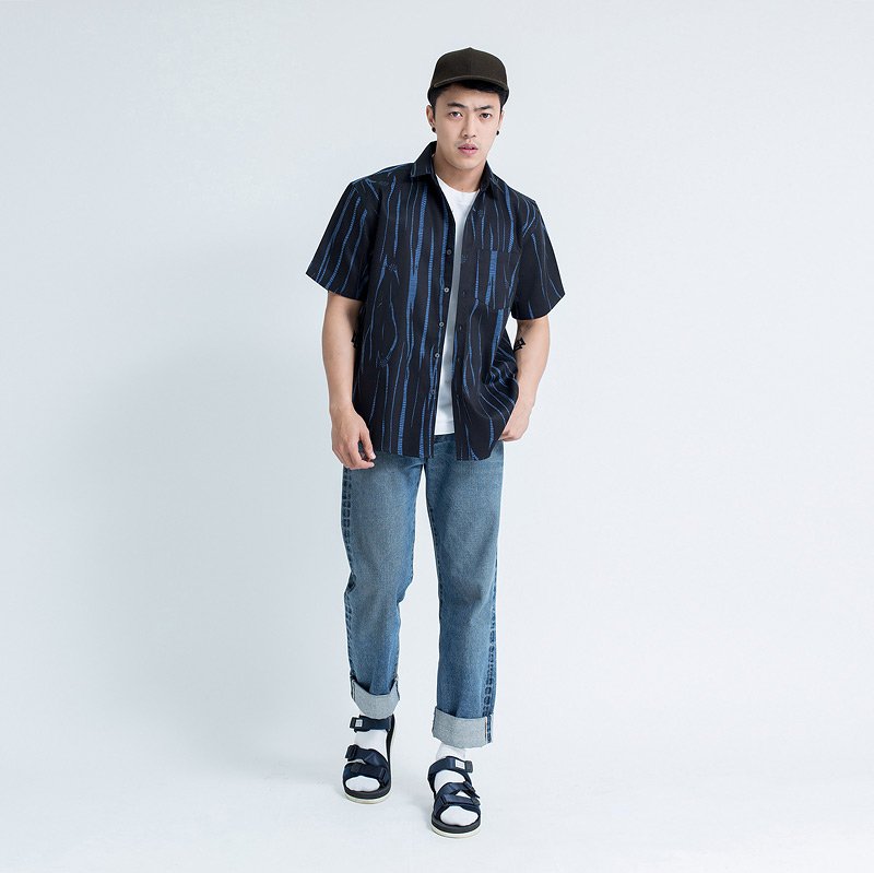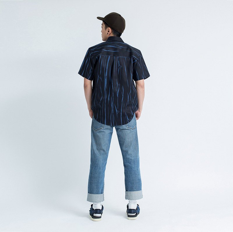 เสื้อเชิ้ตผู้ชายแขนสั้น พิมพ์ลาย Wildwood สีน้ำเงิน พื้นสีดำ งานพิมพ์แน่นทั้งตัว ผ้านุ่ม Cotton 100%
