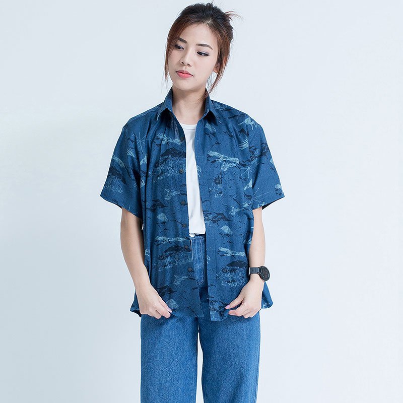 เสื้อเชิ้ตผู้หญิงแขนสั้น พิมพ์ลาย Midnight Wildlife สีน้ำเงินเข้ม งานพิมพ์แน่นทั้งตัว ผ้านุ่ม เนื้อผ้าลินินบาง