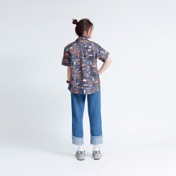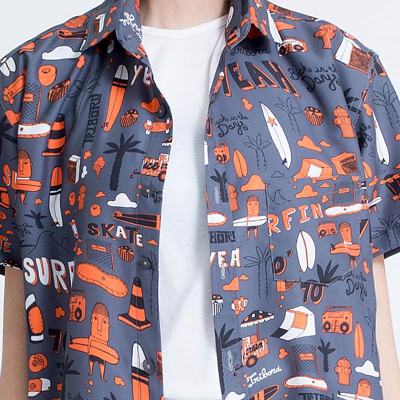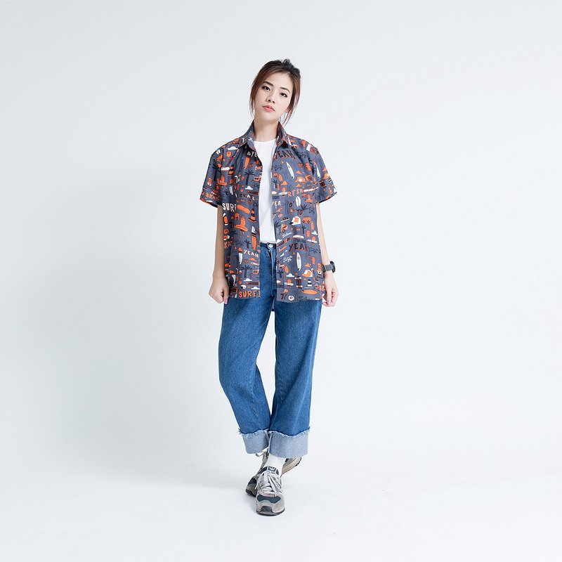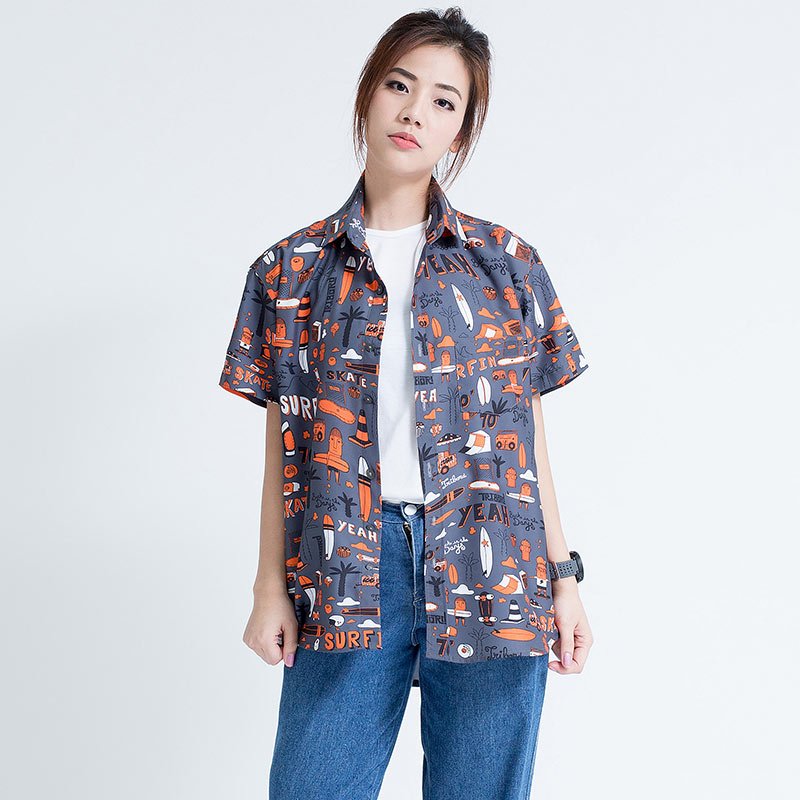 เสื้อเชิ้ตผู้หญิงแขนสั้น พิมพ์ลาย Surf Boy สีส้มดำ พื้นสีเทา งานพิมพ์แน่นทั้งตัว ผ้า Polyester