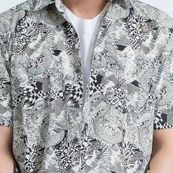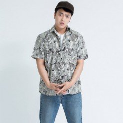 เสื้อเชิ้ตผู้ชายแขนสั้น ลาย Dragon Maze พิมพ์สีดำ พื้นสีครีม งานพิมพ์แน่นทั้งตัว ผ้า Cotton ผสม