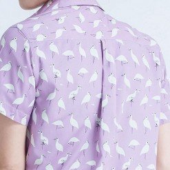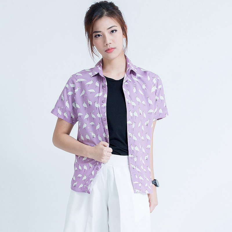 เสื้อเชิ้ตผู้หญิงแขนสั้น พิมพ์ลายจุดรูปนกกระสา Tiny Heron สีม่วงพาสเทล งานพิมพ์แน่นทั้งตัว ผ้าบาง Cotton 100%