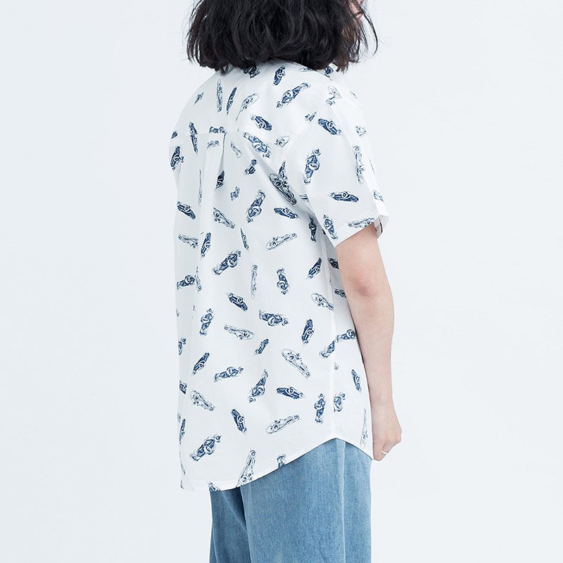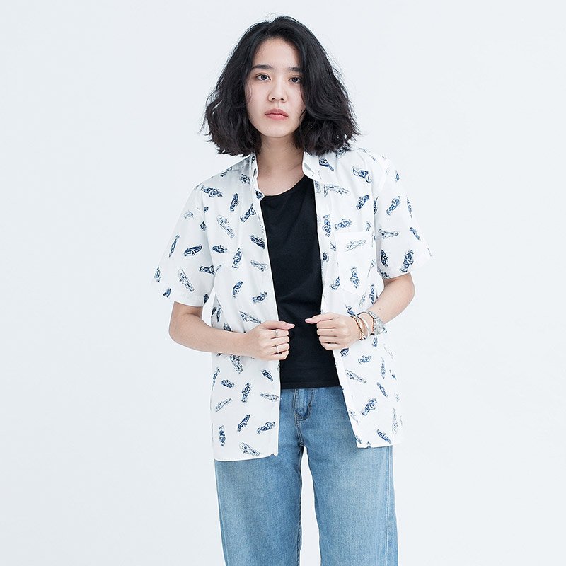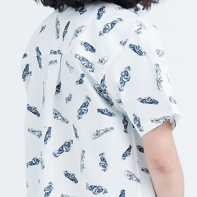 Mr.537 เสื้อเชิ้ตผู้หญิงแขนสั้น ลายจุด Vintage Racing Car สีขาว