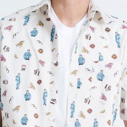 เสื้อเชิ้ตผู้ชายแขนสั้น ลาย 80s Disco สีครีม งานพิมพ์แน่นทั้งตัว ติดกระดุมที่ปกเสื้อ ผ้า Cotton 100%
