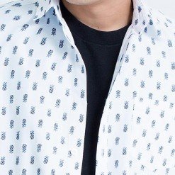 เสื้อเชิ้ตผู้ชายแขนสั้น พิมพ์ลายจุด Baby Pineapple สีน้ำเงิน พื้นสีขาว งานพิมพ์แน่นทั้งตัว ติดกระดุมที่ปกเสื้อ ผ้า Cotton 100%