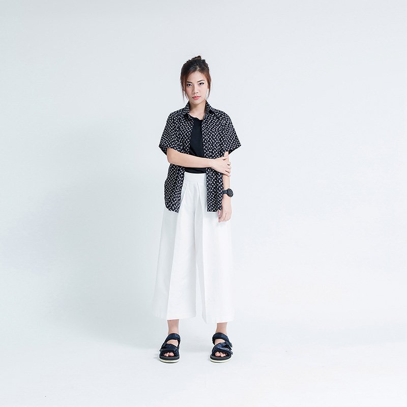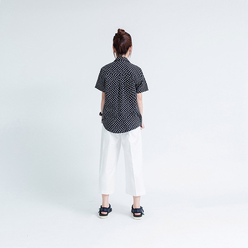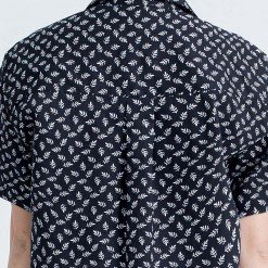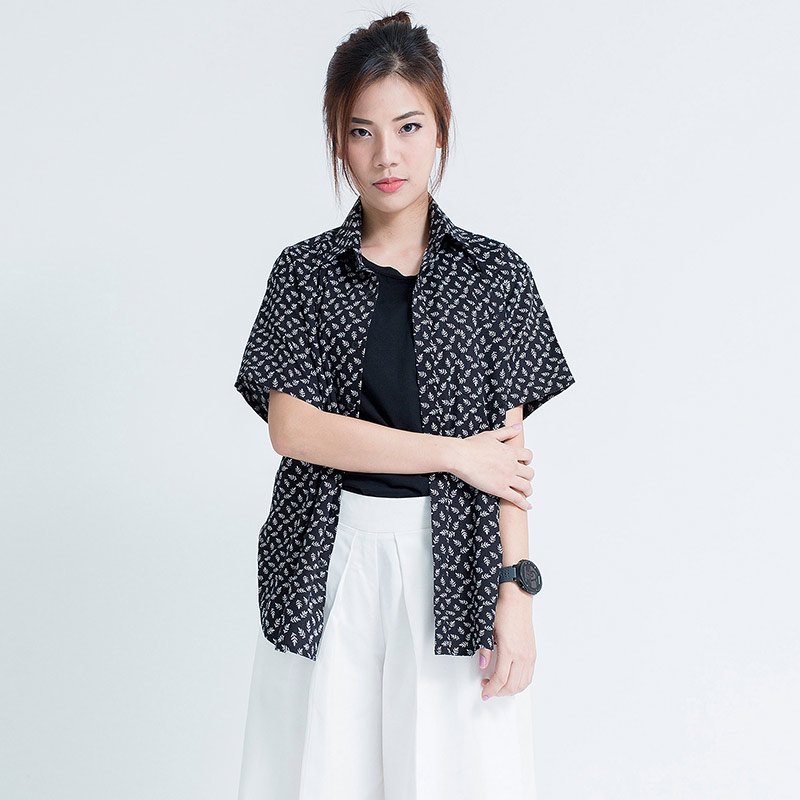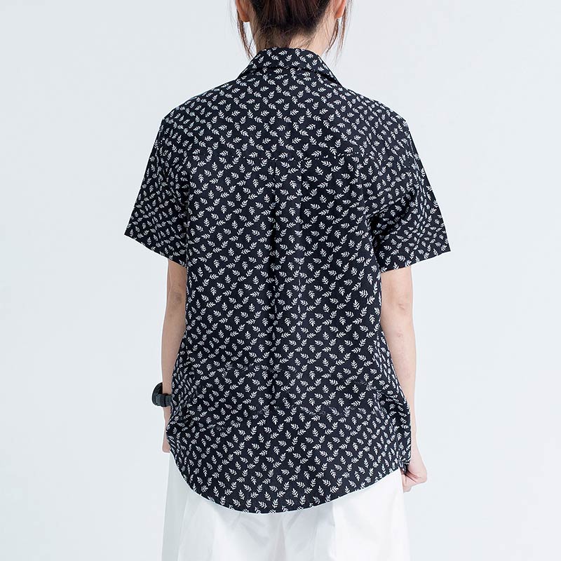 เสื้อเชิ้ตผู้หญิงแขนสั้น พิมพ์ลายจุดรูปใบไม้สีขาว พื้นสีดำ งานพิมพ์แน่นทั้งตัว ติดกระดุมที่ปกเสื้อ ผ้า Cotton 100%