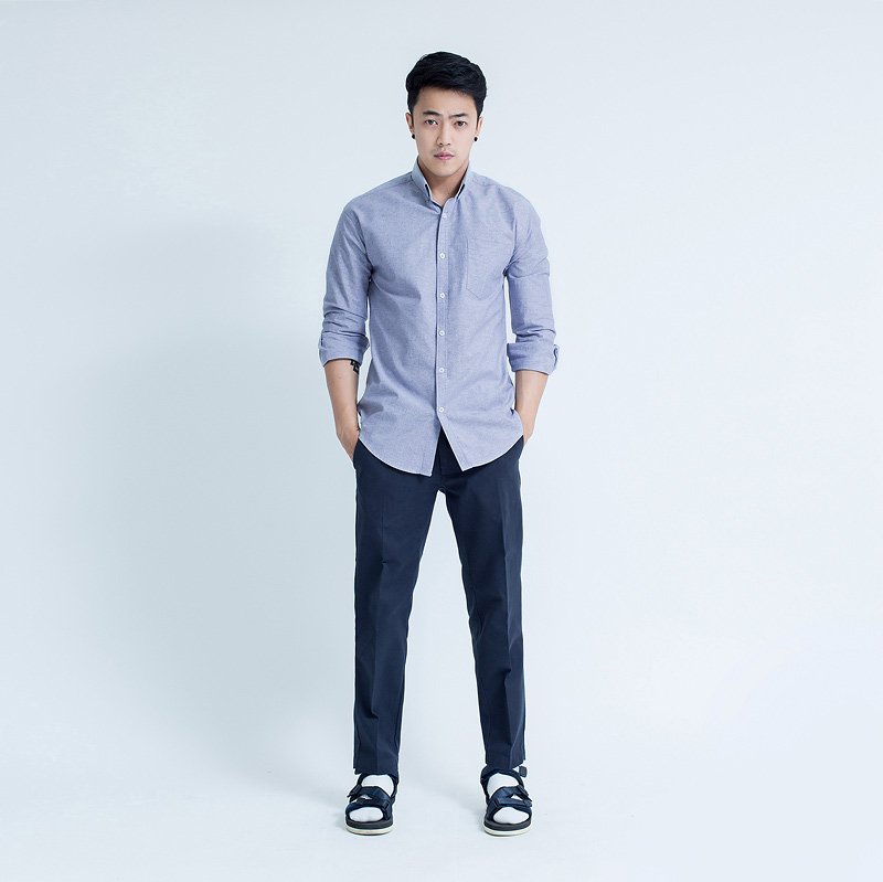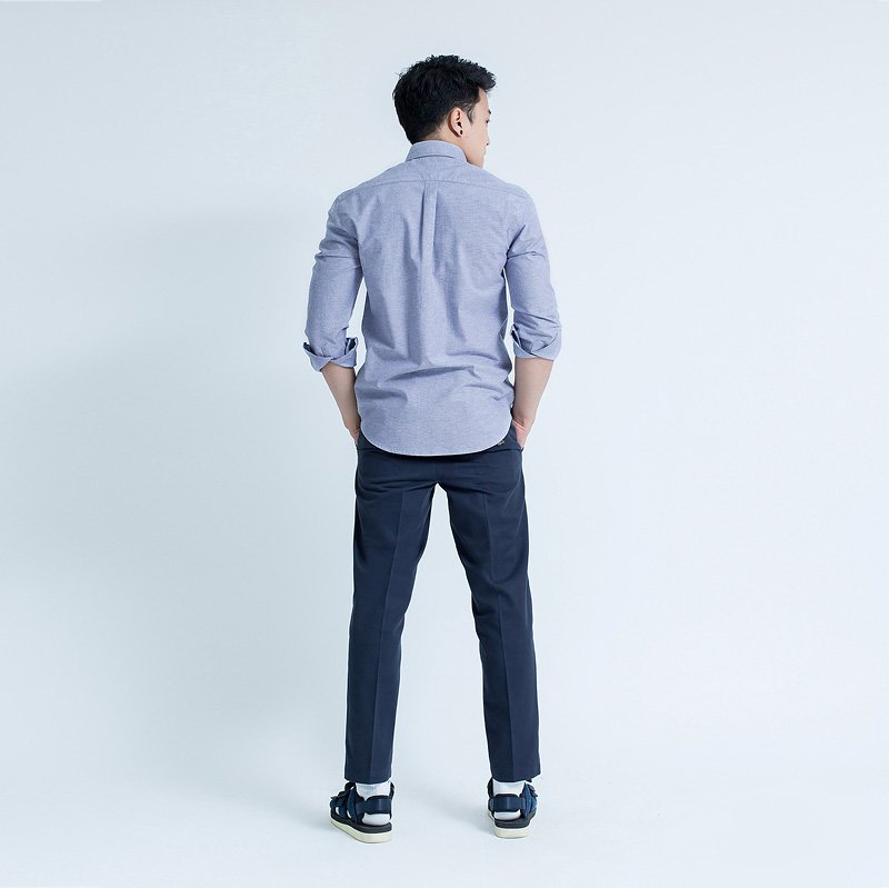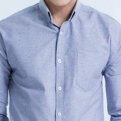 เสื้อเชิ้ตผู้ชายแขนยาว ผ้าอ๊อกฟอร์ด สียีนส์น้ำเงินม่วง ทรงเข้ารูป