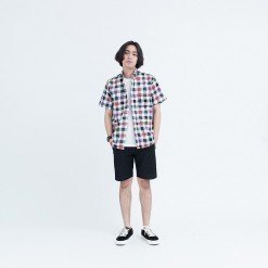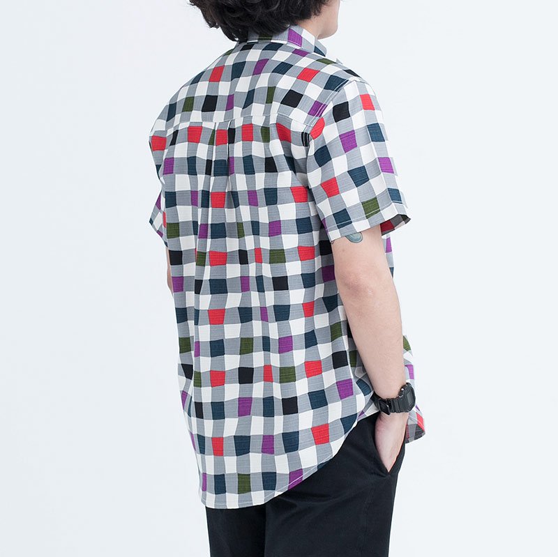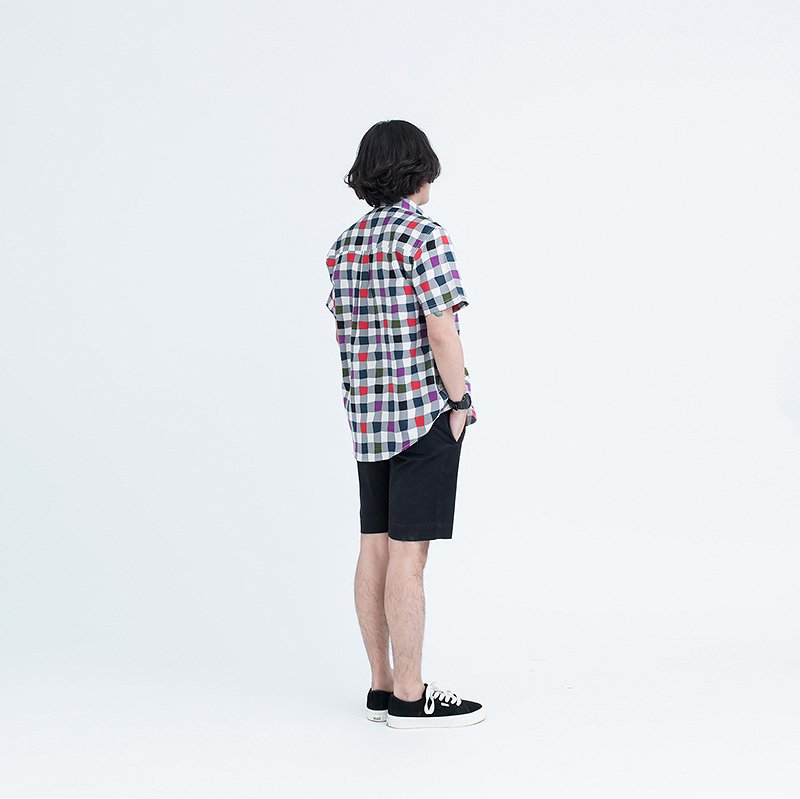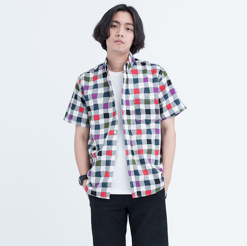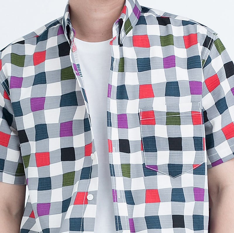 เสื้อเชิ้ตผู้ชายแขนสั้น พิมพ์ลายตาราง Multi Plaid สีเทา แดง น้ำเงิน เขียว พื้นสีเทา ติดกระดุมที่ปกเสื้อ ผ้านุ่ม เนื้อผ้าลินิน Cotton ญี่ปุ่น ทอละเอียด