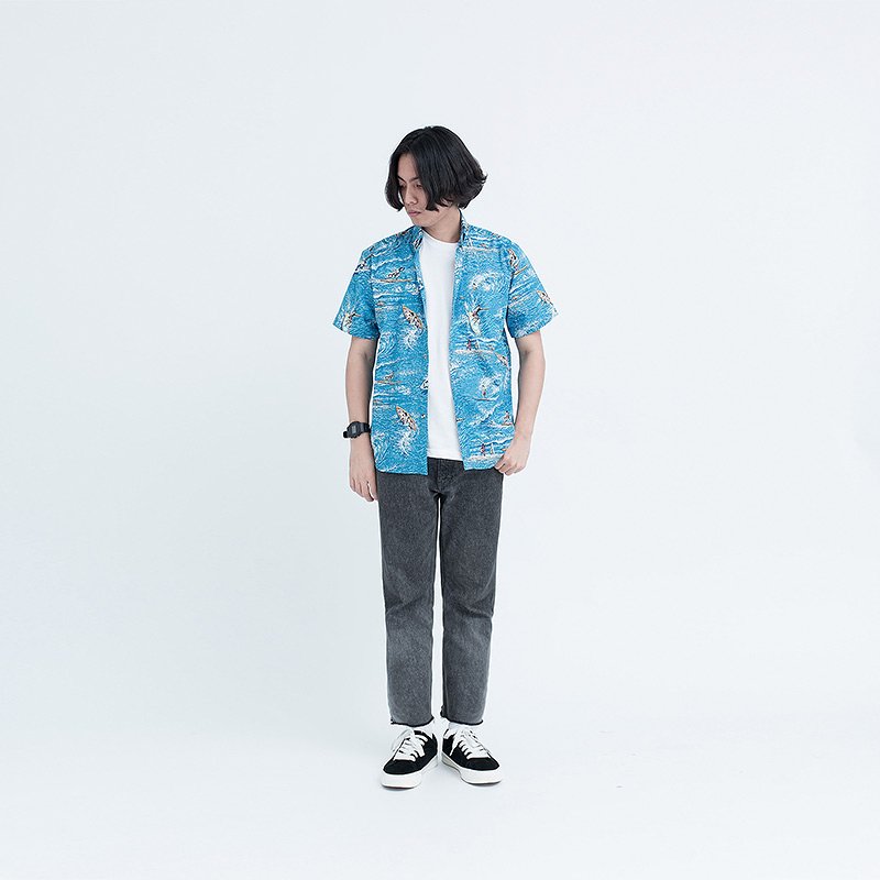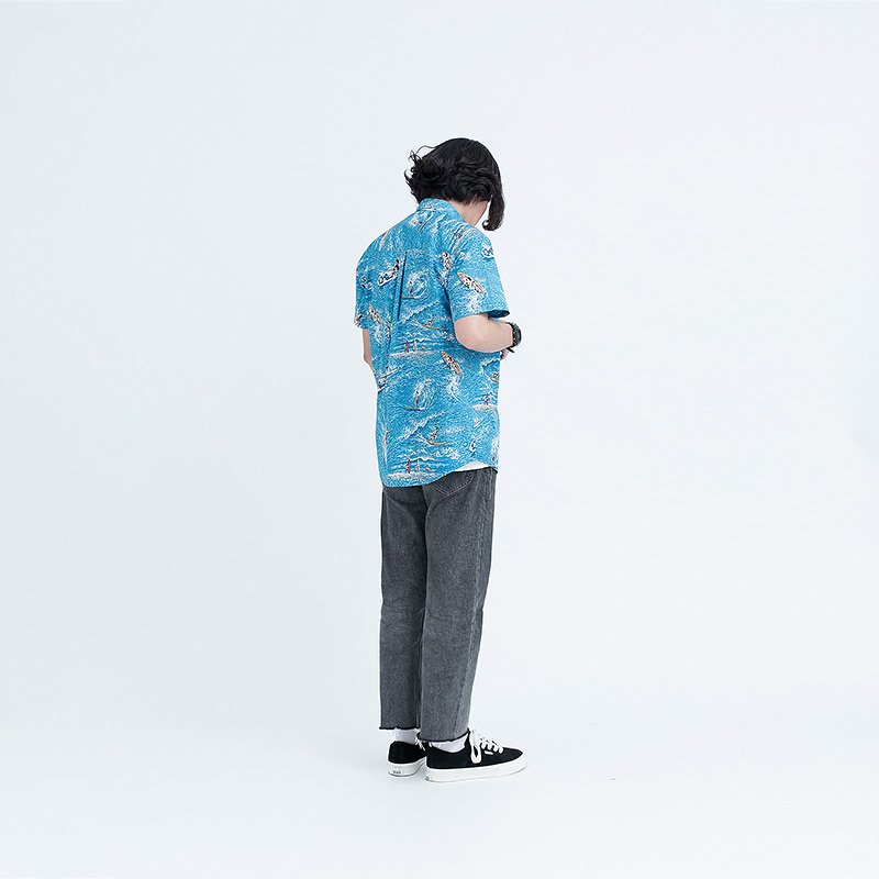เสื้อเชิ้ตผู้ชายแขนสั้น พิมพ์ลาย Surfing Morning สีเขียวเวอร์ริเดียน งานพิมพ์แน่นทั้งตัว ติดกระดุมที่ปกเสื้อ ผ้ามาตราฐาน Cotton 100%