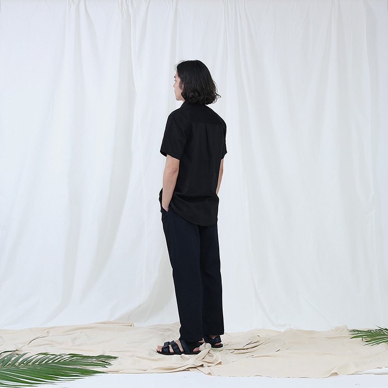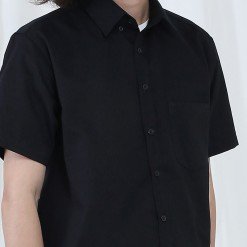 เสื้อเชิ้ตผู้ชายแขนสั้น พื้นเรียบสี Super Black ดำ ติดกระดุมที่ปกเสื้อ เนื้อผ้าดี Cotton 100%