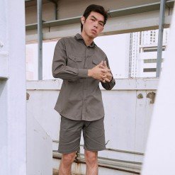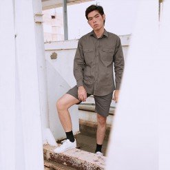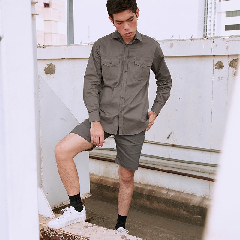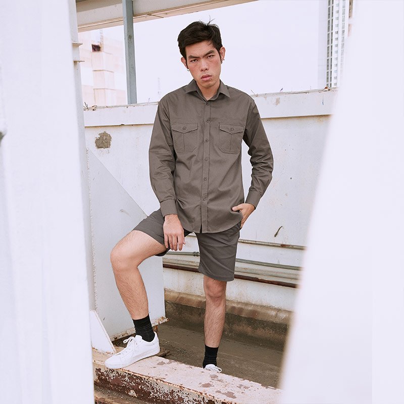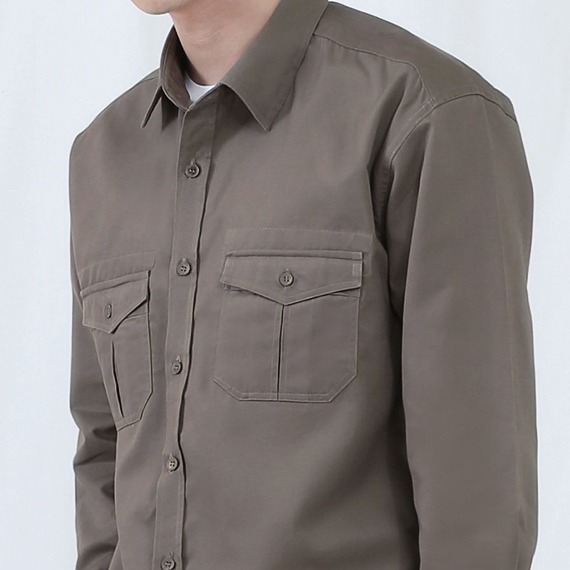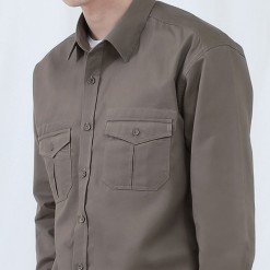 เสื้อเชิ้ตผู้ชายแขนยาว พื้นเรียบสี Khaki น้ำตาลเบจเข้ม ติดกระเป๋าหน้าสองข้าง เนื้อผ้าดี Cotton 100%