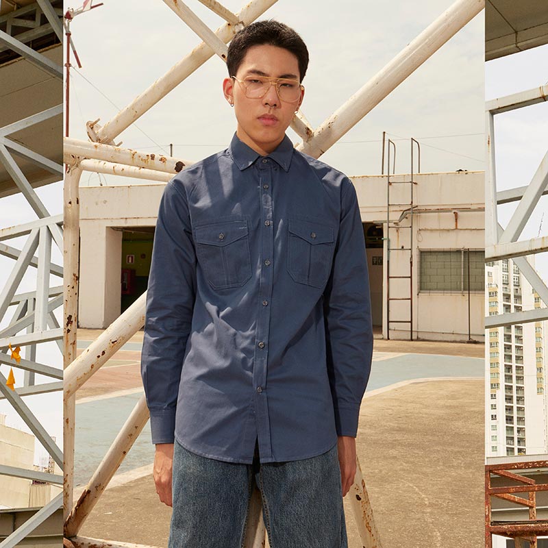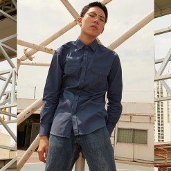 เสื้อเชิ้ตผู้ชายแขนยาว พื้นเรียบสี Washed Navy น้ำเงินเข้ม กระเป๋า Camo หน้าสองข้าง ติดกระดุมที่ปกเสื้อ เนื้อผ้าดี Cotton 100%