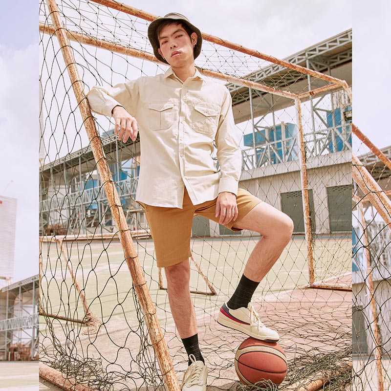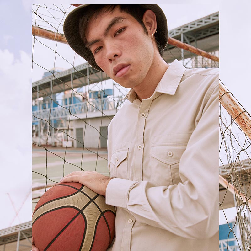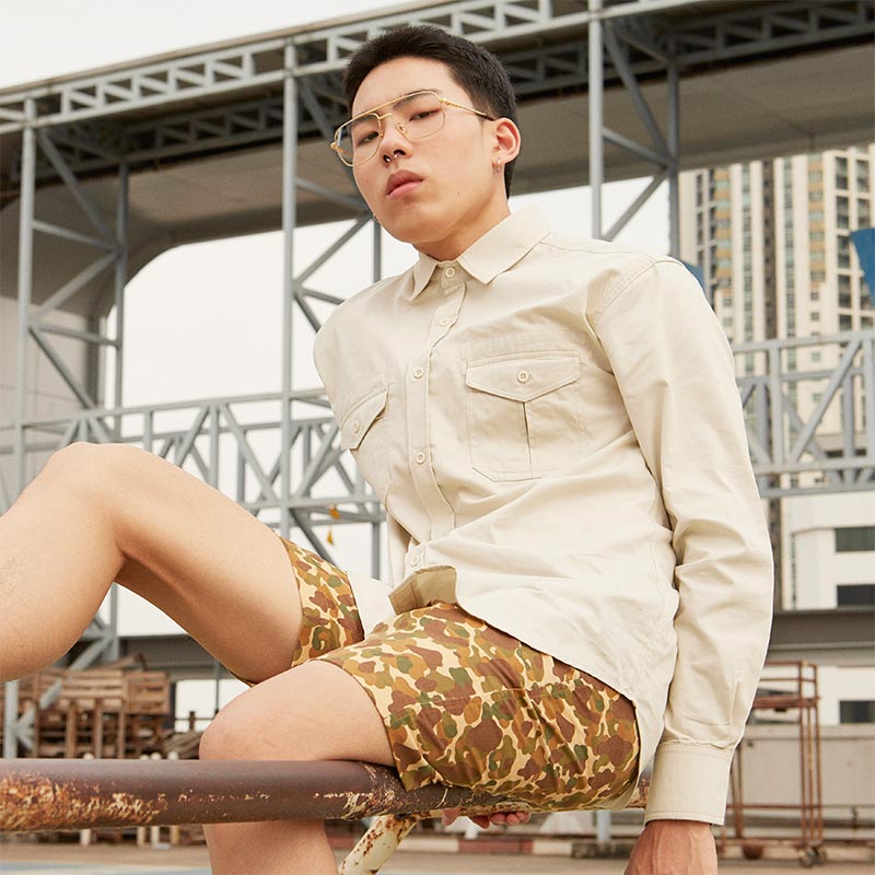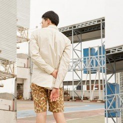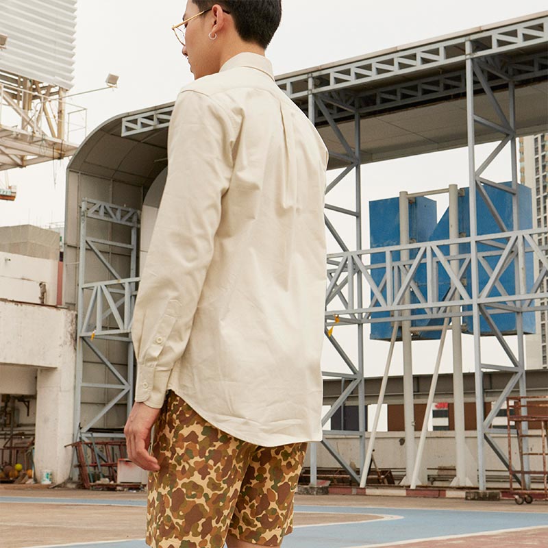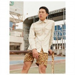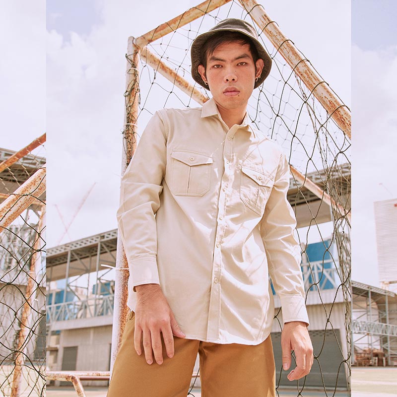 เสื้อเชิ้ตผู้ชายแขนยาว พื้นเรียบสี Taupe ครีม กระเป๋า Camo หน้าสองข้าง เนื้อผ้าดี Cotton 100%