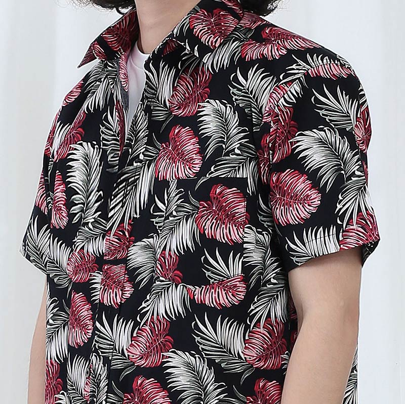 เสื้อเชิ้ตผู้ชายแขนสั้น พิมพ์ลาย Palm’s Leaf สีดำแดง งานพิมพ์แน่นทั้งตัว ผ้า Cotton 100%