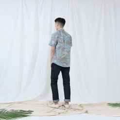 เสื้อเชิ้ตผู้ชายแขนสั้น พิมพ์ลายฮาวาย Banana Leaf Print Button-Down Shirt สีฟ้าม่วง พื้นสีเทา งานพิมพ์แน่นทั้งตัว ติดกระดุมที่ปกเสื้อ ผ้าญี่ปุ่น เนิ้อผ้าดี Cotton 100%
