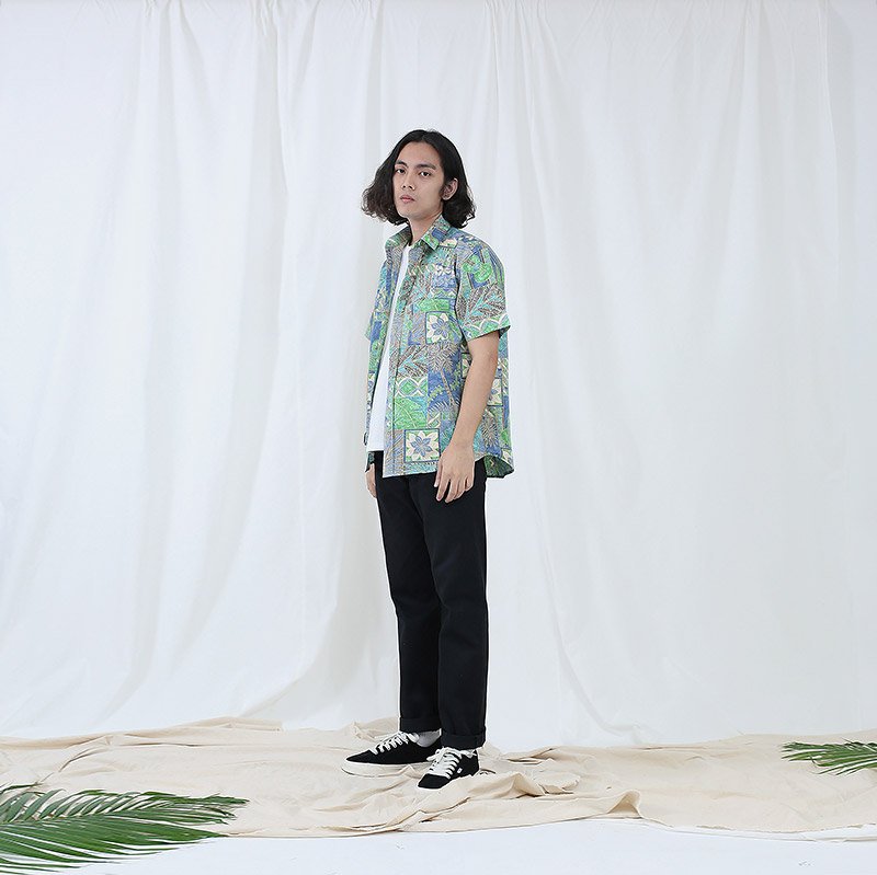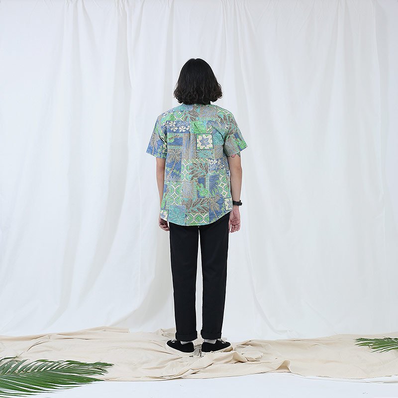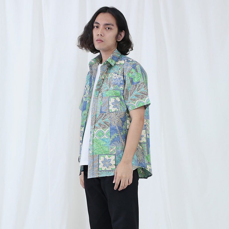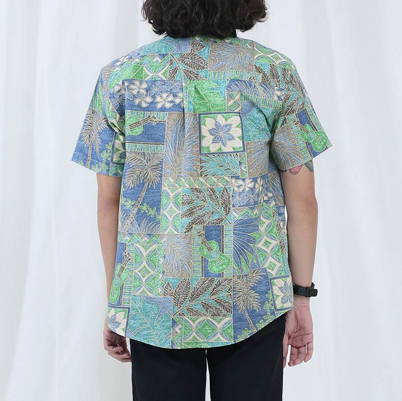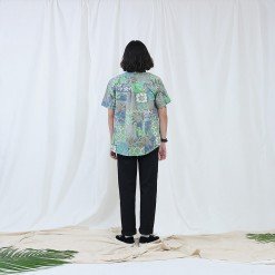 Mr.675 เสื้อเชิ้ตผู้ชายแขนสั้น ลายฮาวาย NEON ALOHAA สีเขียวฟ้า
