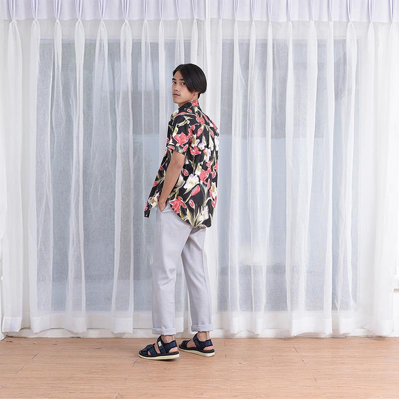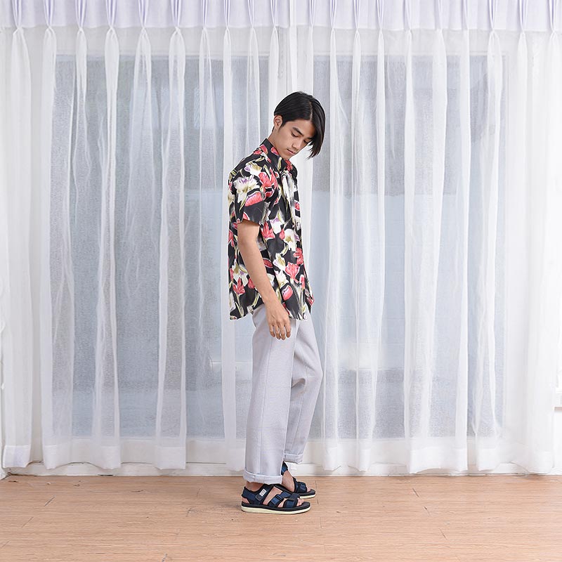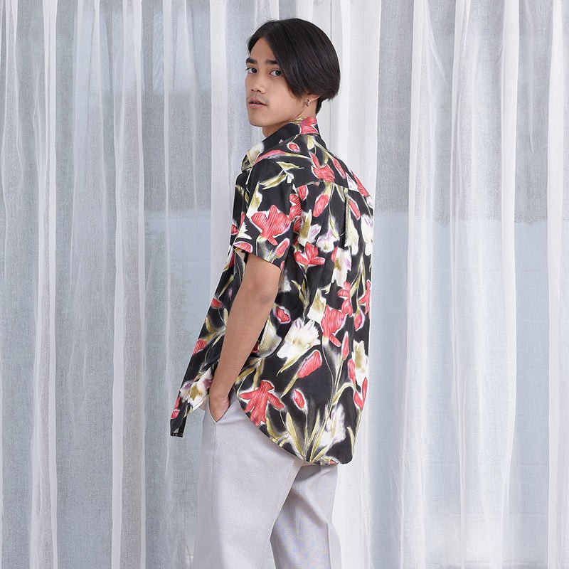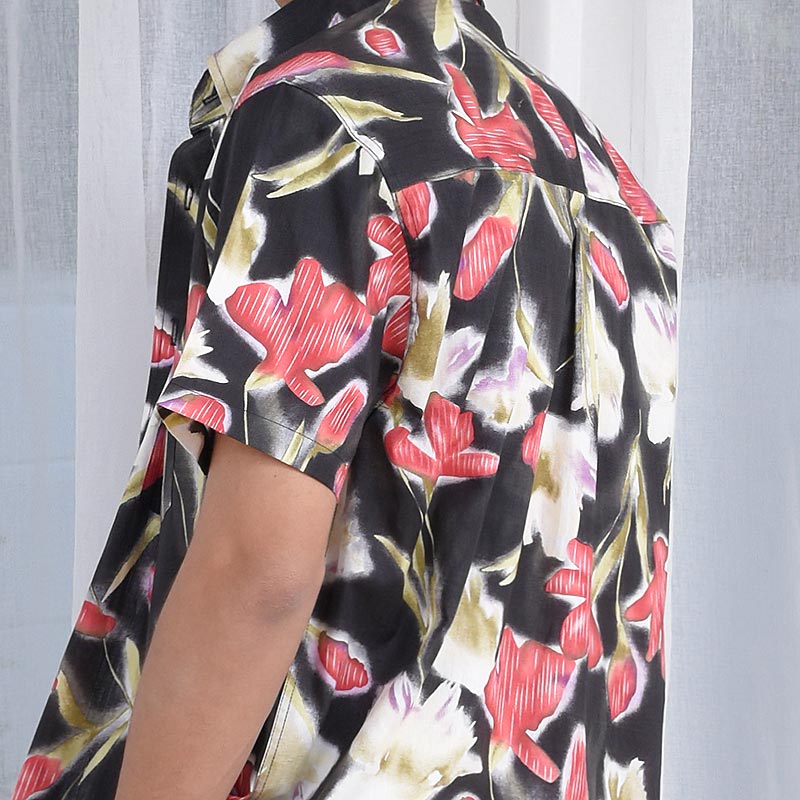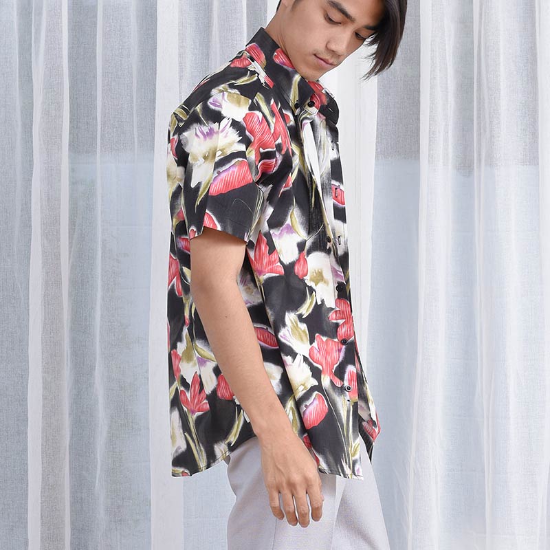 เสื้อเชิ้ตผู้ชายแขนสั้น พิมพ์ลายดอกฮาวาย Fading Flower สีแดง พื้นสีดำ งานพิมพ์แน่นทั้งตัว ติดกระดุมที่ปกเสื้อ ผ้านำเข้าญี่ปุ่น ทอละเอียด เนิ้อผ้าดีมี Texture ผ้าญี่ปุ่น Cotton 100%