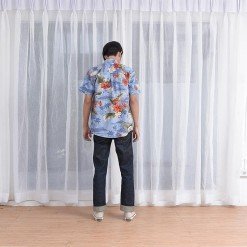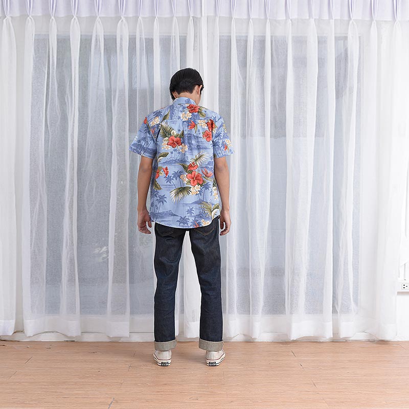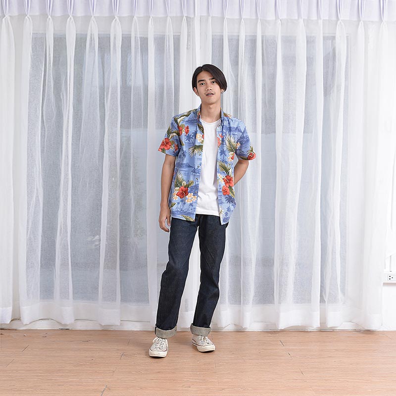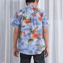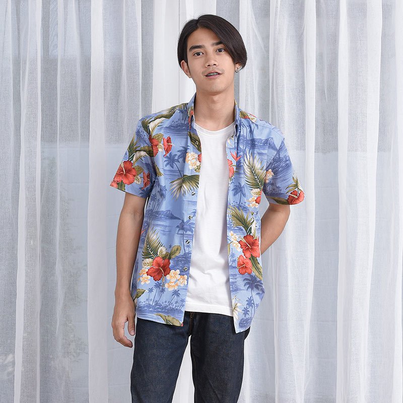 Mr.700 เสื้อเชิ้ตผู้ชายแขนสั้น ลายดอกฮาวาย Blue ALOHAA ดอกแดงพื้นฟ้า