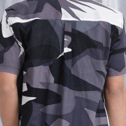 เสื้อเชิ้ตผู้ชายแขนสั้น พิมพ์ลาย Abstract Greyscale สีขาว เทา ดำ ติดกระดุมที่ปกเสื้อ ผ้าทอละเอียด เนิ้อผ้านุ่ม Cotton 100%