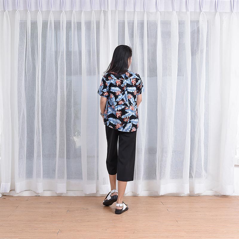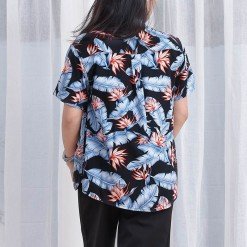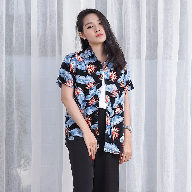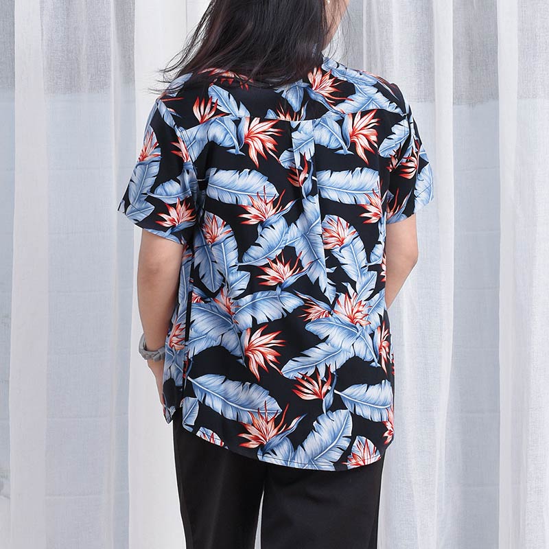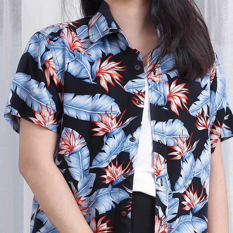 เสื้อเชิ้ตผู้หญิงแขนสั้น พิมพ์ลายดอกฮาวาย Red Bird of Paradise สีแดงฟ้า พื้นสีดำ งานพิมพ์แน่นทั้งตัว เนื้อผ้าทิ้งตัว ผ้าฮาวาย Cotton ผสม Rayon