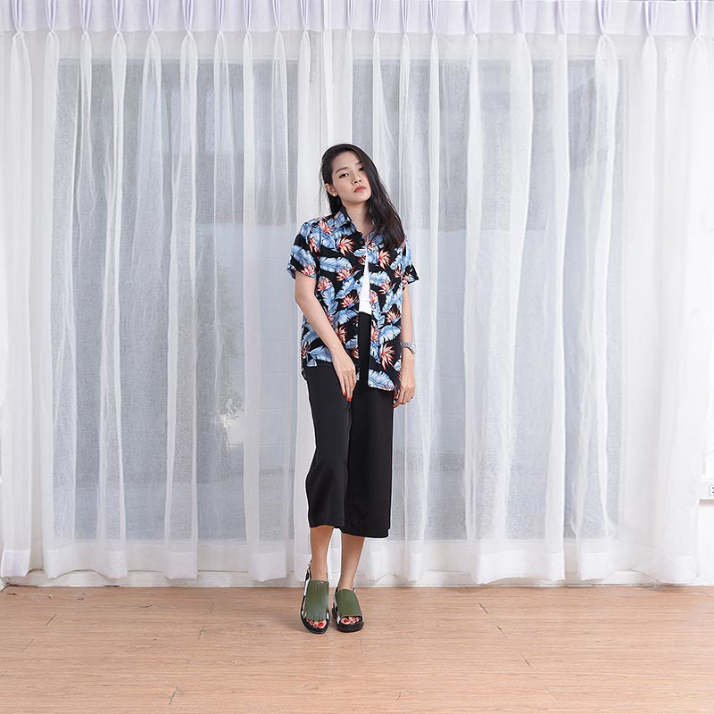 Mr.713 เสื้อเชิ้ตผู้หญิงแขนสั้น ลายดอกฮาวาย Red Bird of Paradise สีแดงฟ้าพื้นสีดำ