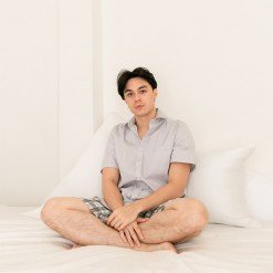 เสื้อเชิ้ตผู้ชายแขนสั้น Oxford Shirt สีเทาอ่อน โทนสีพาสเทล ติดกระดุมที่ปกเสื้อ ผ้านุ่มทอละเอียดเส้นด้ายบางพิเศษ เนื้อผ้า Cotton