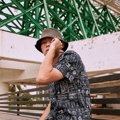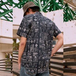 เสื้อเชิ้ตผู้ชายแขนสั้น พิมพ์ลาย VINTAGE TAILOR สีน้ำเงินเข้ม งานพิมพ์แน่นทั้งตัว ติดกระดุมที่ปกเสื้อ ผ้าทอละเอียด Cotton 100%