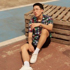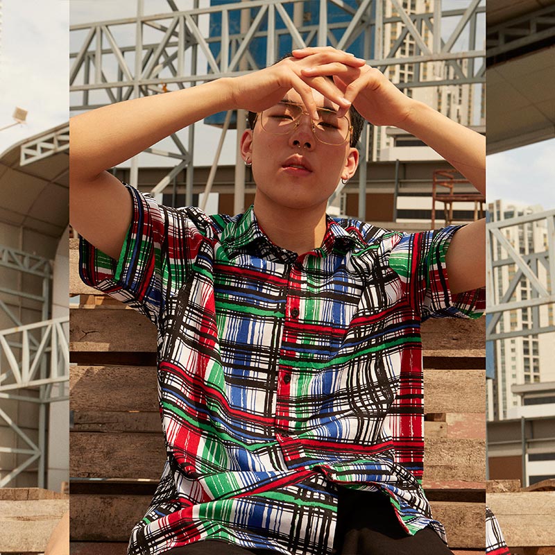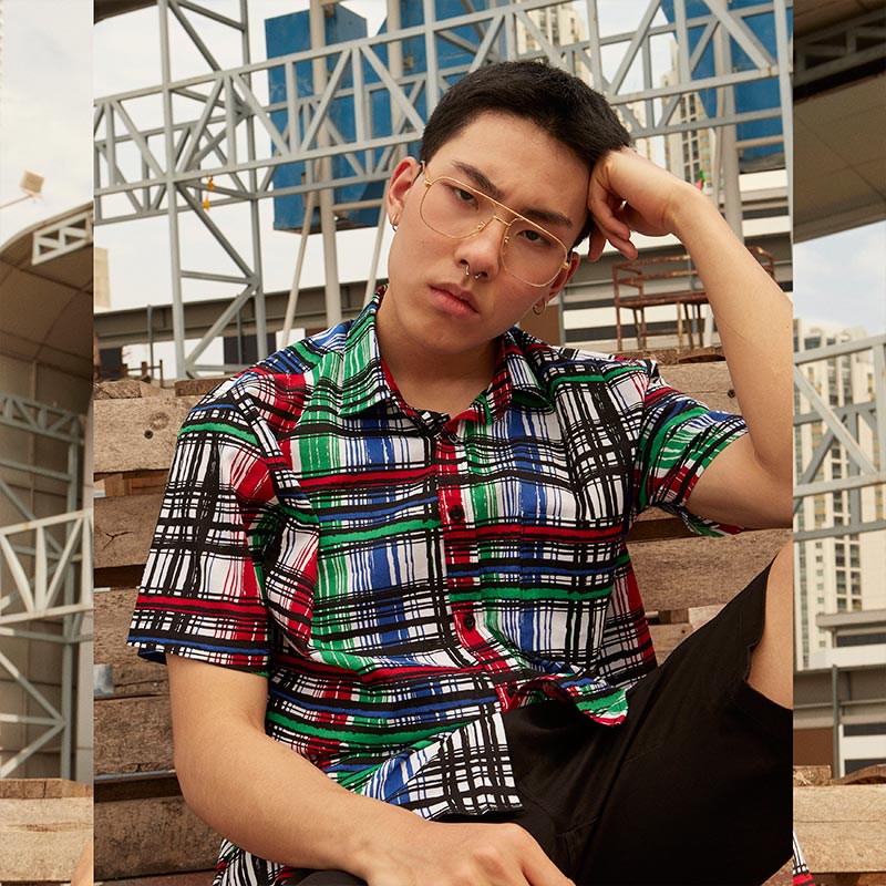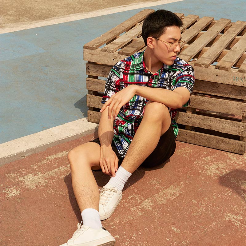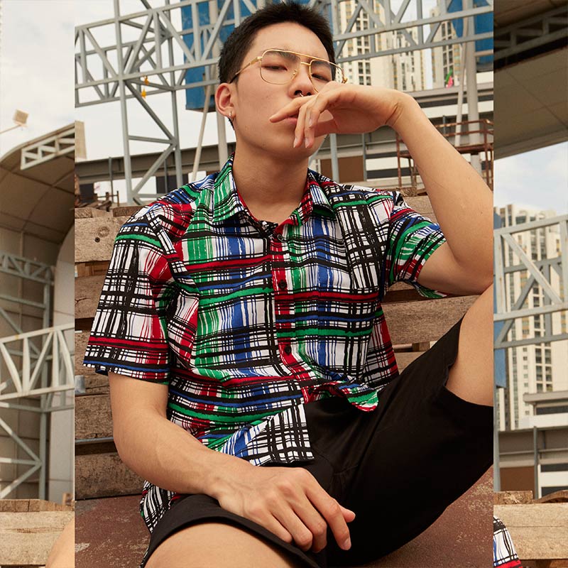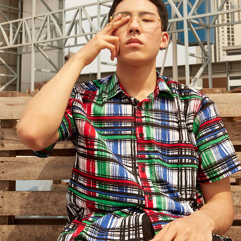 Mr.770 เสื้อเชิ้ตผู้ชายแขนสั้น ลายตาราง POP-ART Plaid สี Multi Color พื้นขาว