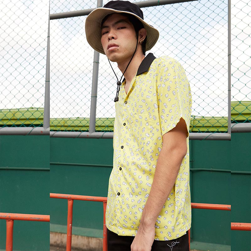เสื้อเชิ้ตทรงฮาวายผู้ชาย พิมพ์ลายจุด Popcorn Black Collar สีเหลือง ผ้า Cotton พิมพ์ลายกราฟฟิคตัดสีด้วยปกดำ