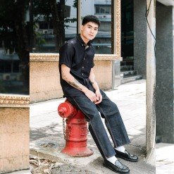 เสื้อเชิ้ตผู้ชายแขนสั้น ผ้าเดนิมญี่ปุ่นหนา สไตล์วินเทจ Workwear สียีนส์กรมเข้มอินเทรนด์สุดๆ แมตช์ลุคง่ายๆกับกางเกงยีนส์คลาสสิค มีดีเทลลงด้ายยีนส์สีทอง ติดกระดุมที่ปกเสื้อ ลุคคูลมากๆ