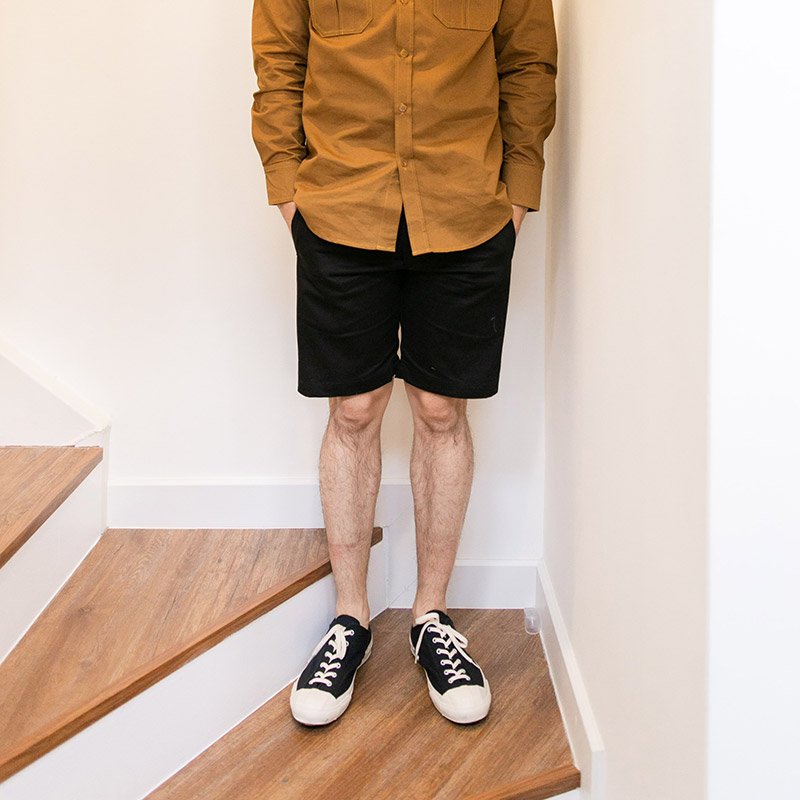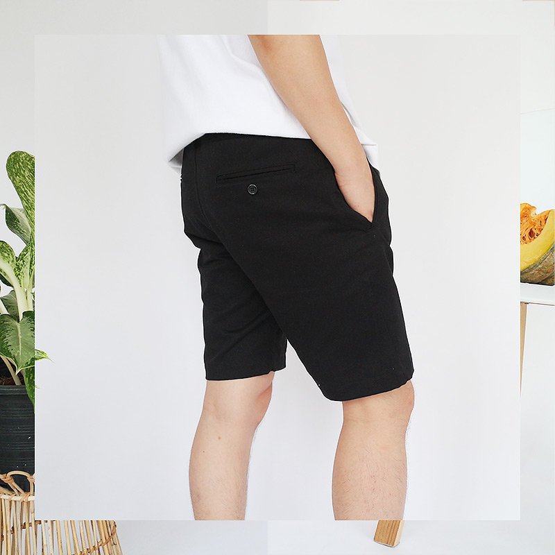 กางเกงขาสั้นผู้ชาย ผ้าชิโน Cotton Peach ฟอกนิ่ม สีดำ เนื้อผ้านุ่มพิเศษ ใส่สบาย ออกแบบด้วยกระเป๋าเจาะด้านข้างและด้านหลัง ทรง Regular Shorts
