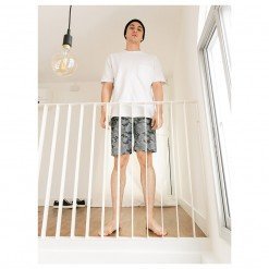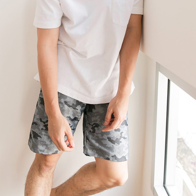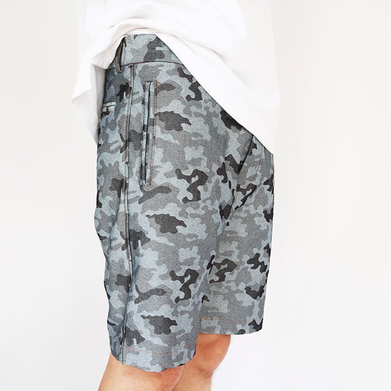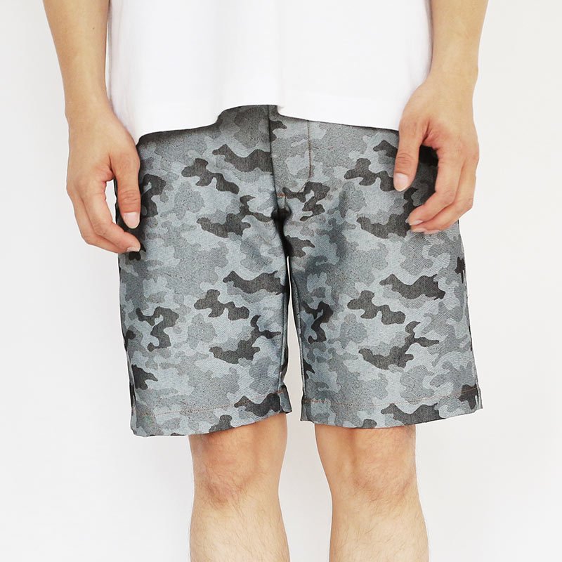 กางเกงขาสั้นผู้ชาย ผ้ายีนส์ลายพราง CAMO สีเทา งานทอละเอียด ผ้ายีนส์ Cotton หนา 10-12oz ลงด้ายยีนส์สีน้ำตาลทอง ออกแบบด้วยกระเป๋าเจาะด้านข้างและด้านหลัง ทรง Regular Shorts