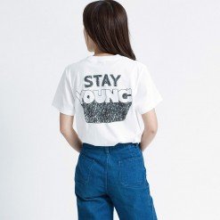 เสื้อยืดผู้หญิงแขนสั้น ลาย Stay Young เทคนิคสกรีนสีน้ำ เสื้อสีขาว ผ้านุ่ม Cotton 100% สวมใส่สบาย ระบายอากาศ และซับเหงื่อได้ดี