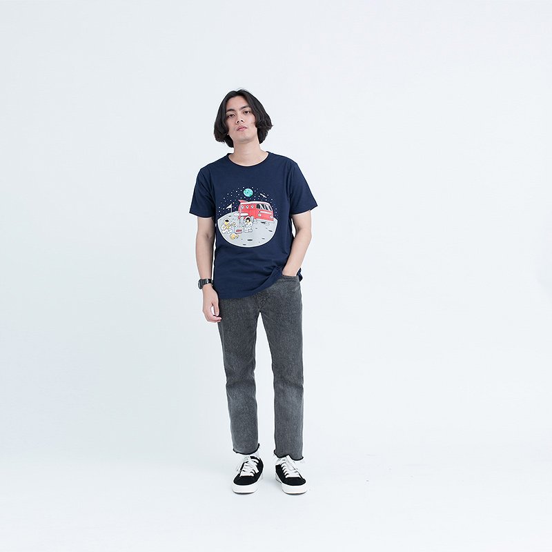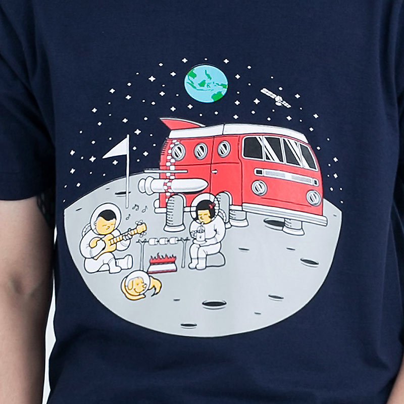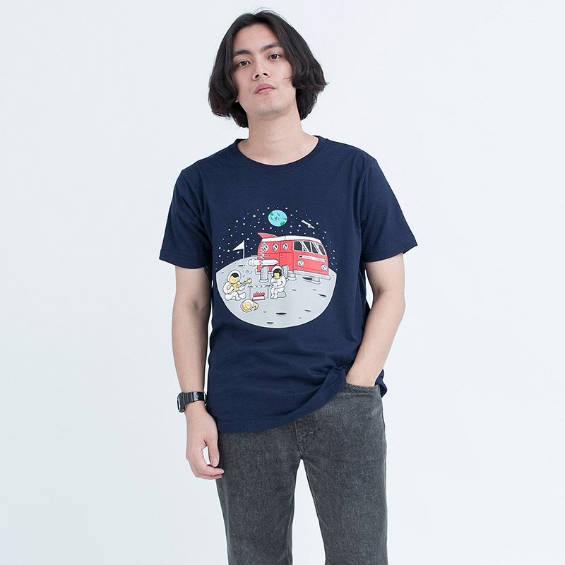 เสื้อยืดผู้ชายแขนสั้น ลาย Astronauts เทคนิคสกรีน สีพลาสติซอล เสื้อสีน้ำเงินเข้ม ผ้านุ่ม Cotton 100% สวมใส่สบาย ระบายอากาศ และซับเหงื่อได้ดี