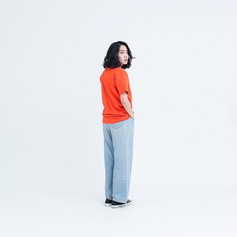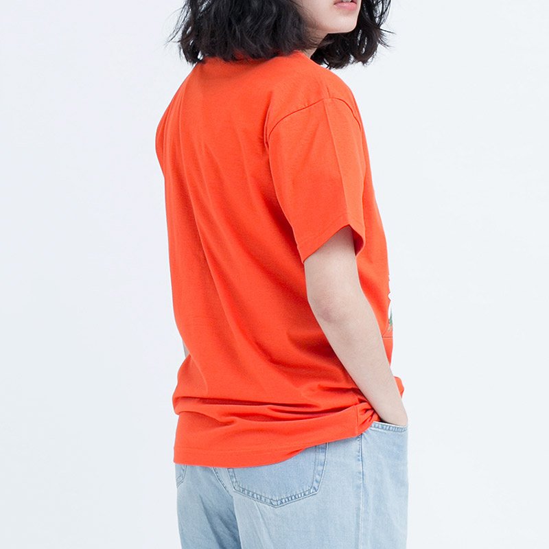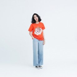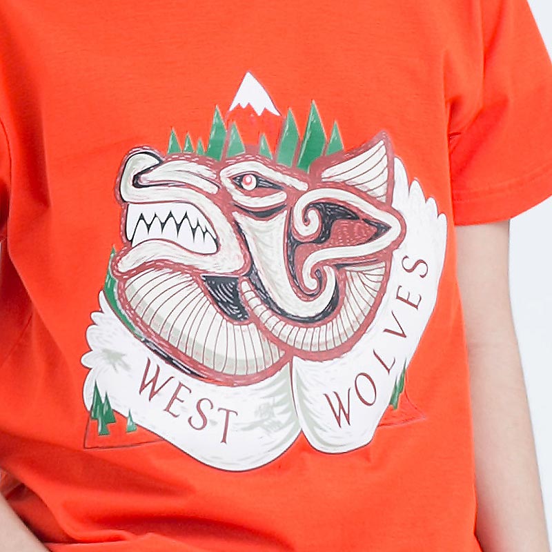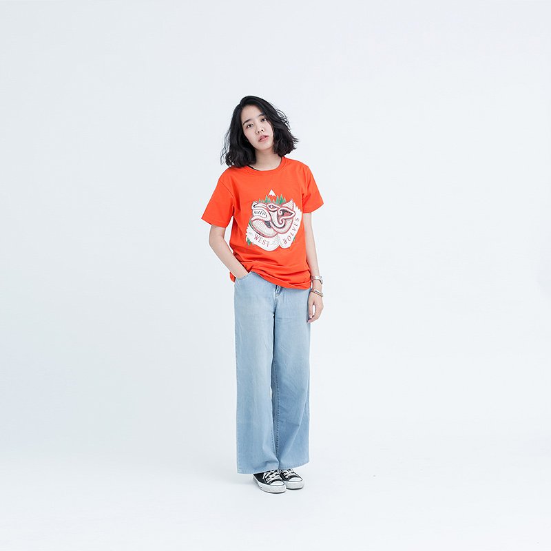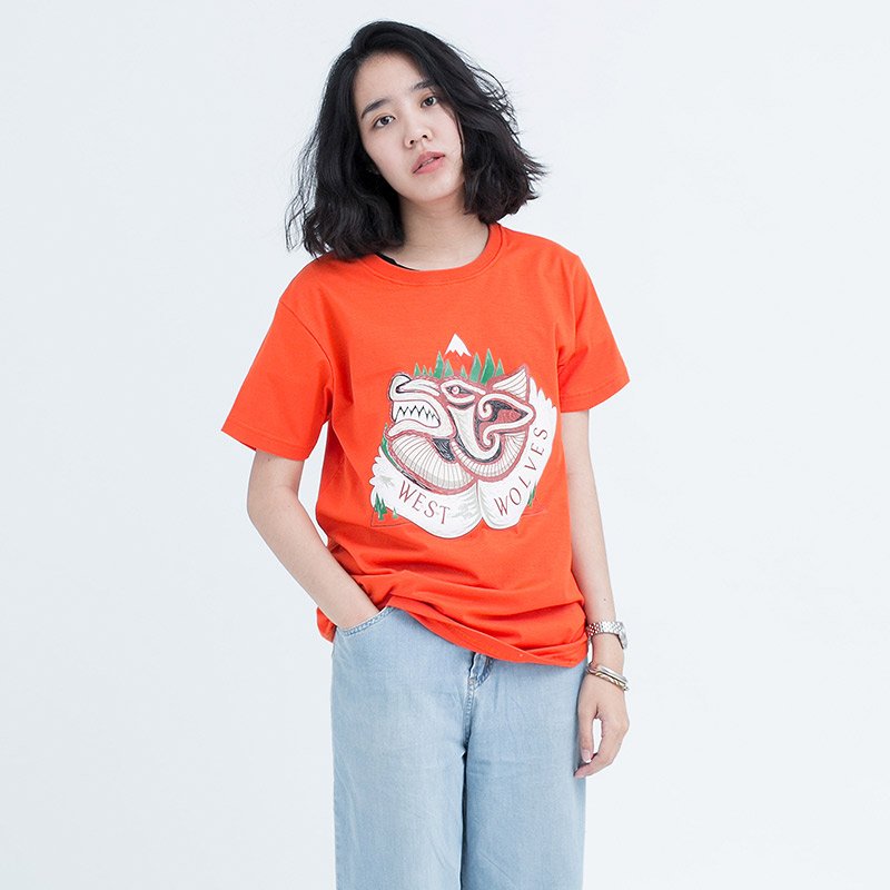 เสื้อยืดผู้หญิงแขนสั้น ลาย West Wolves เทคนิคสกรีน สีพลาสติซอล เสื้อสีส้มแดง ผ้านุ่ม Cotton 100% สวมใส่สบาย ระบายอากาศ และซับเหงื่อได้ดี