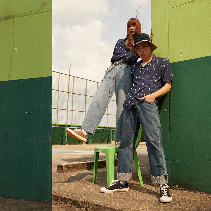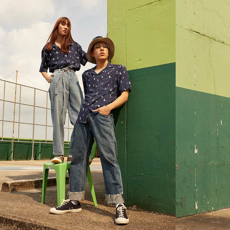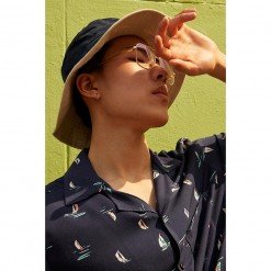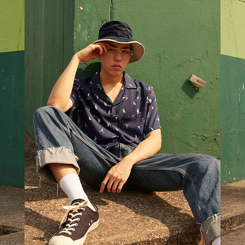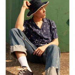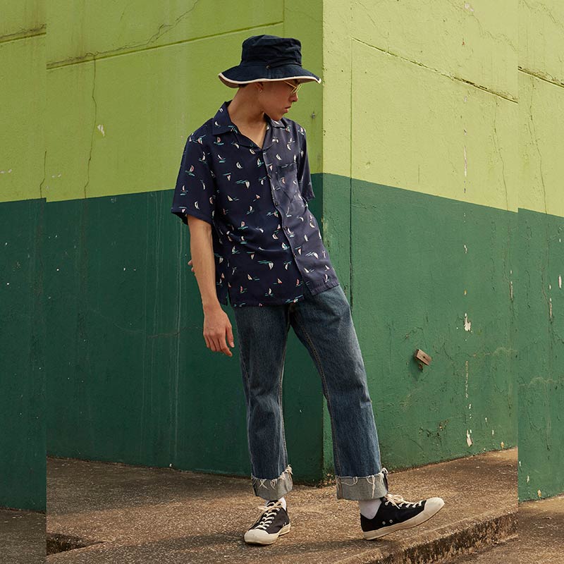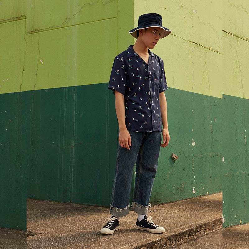 YMS-001 เสื้อเชิ้ตทรงฮาวายผู้ชาย Tiny Ship Shirt สีน้ำเงินเข้ม