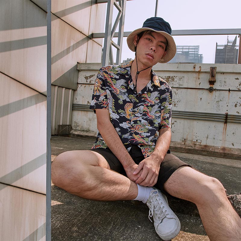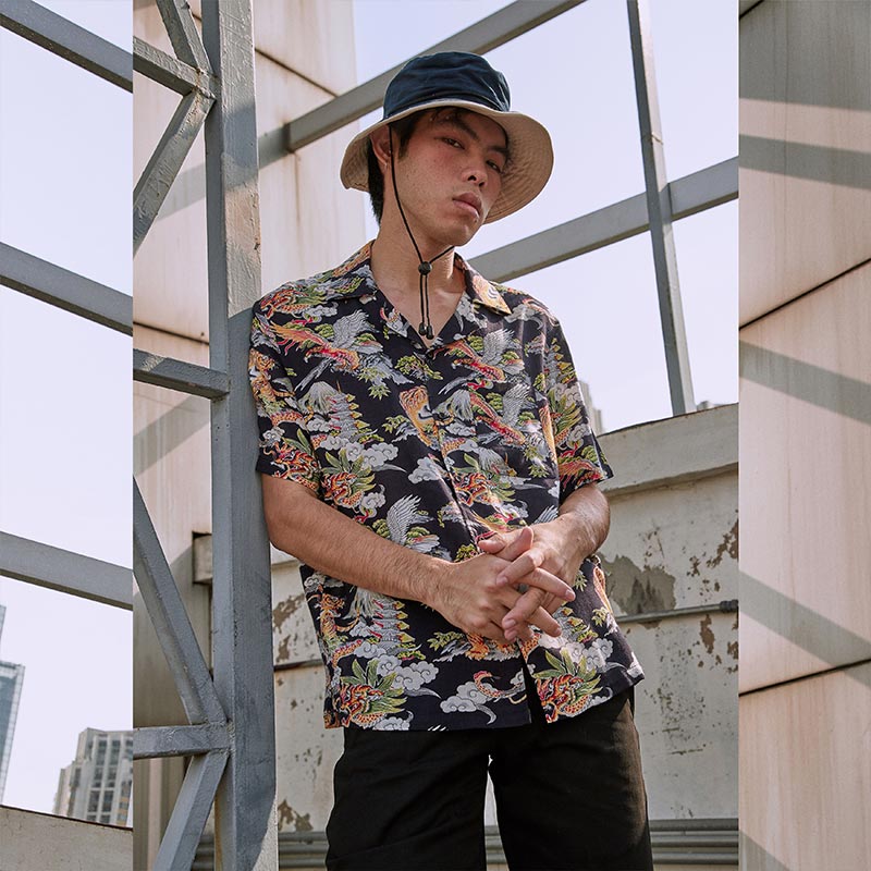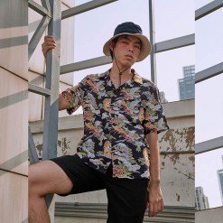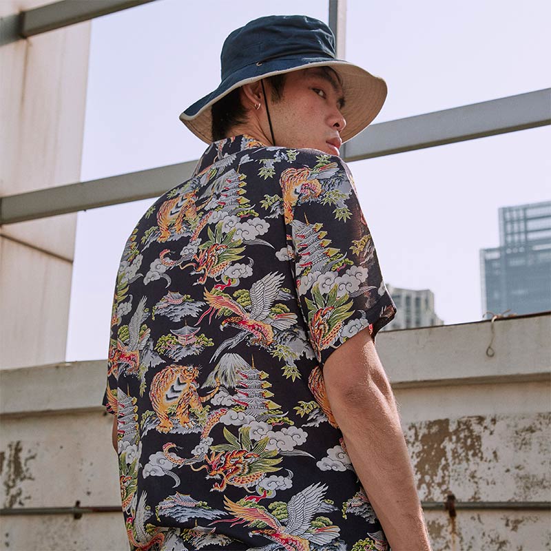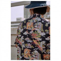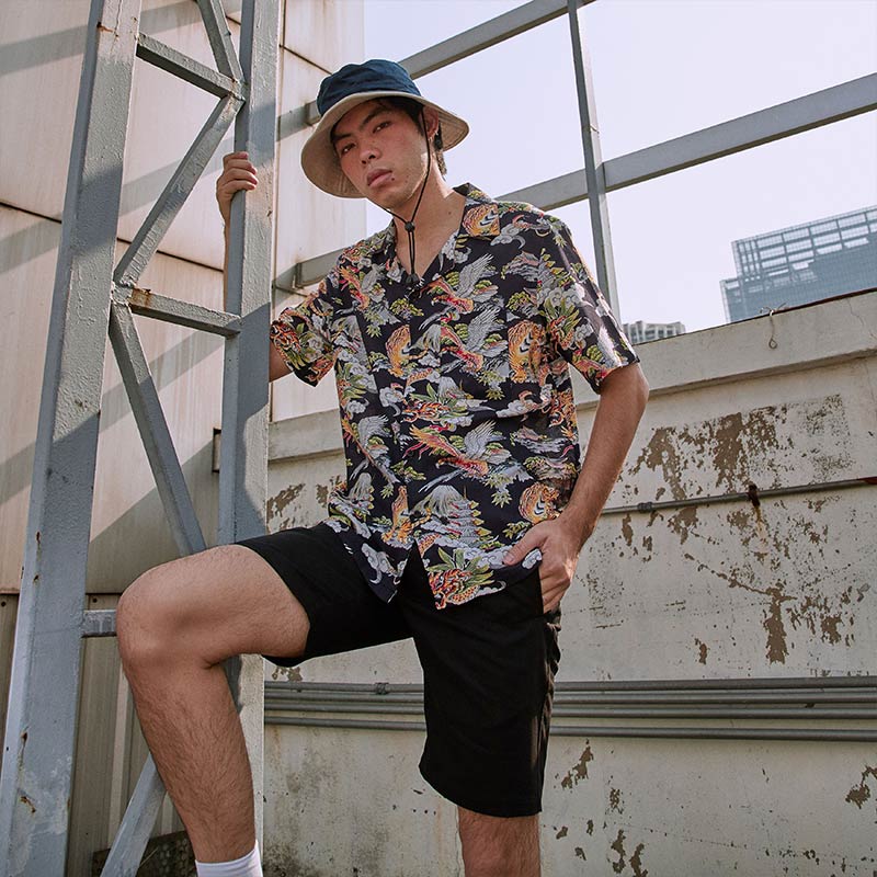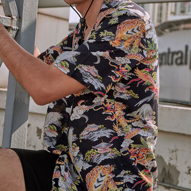 YMS-006 เสื้อเชิ้ตทรงฮาวายผู้ชาย Chinoiserie Tiger สีดำ