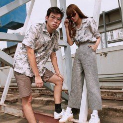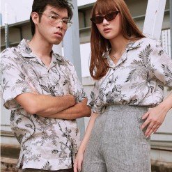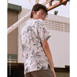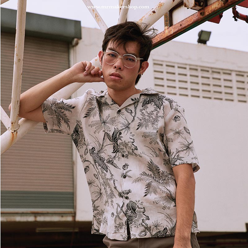 YMS-009 เสื้อเชิ้ตทรงฮาวายผู้ชาย ลายดอก Darjeeling Linen Floral สีเทาอ่อน